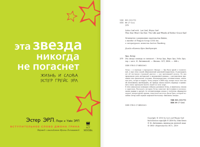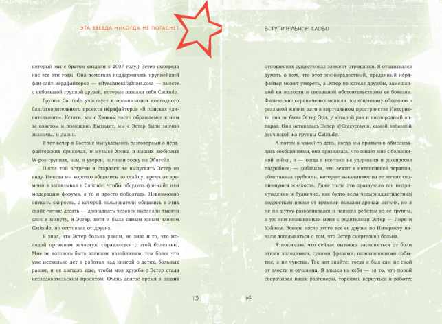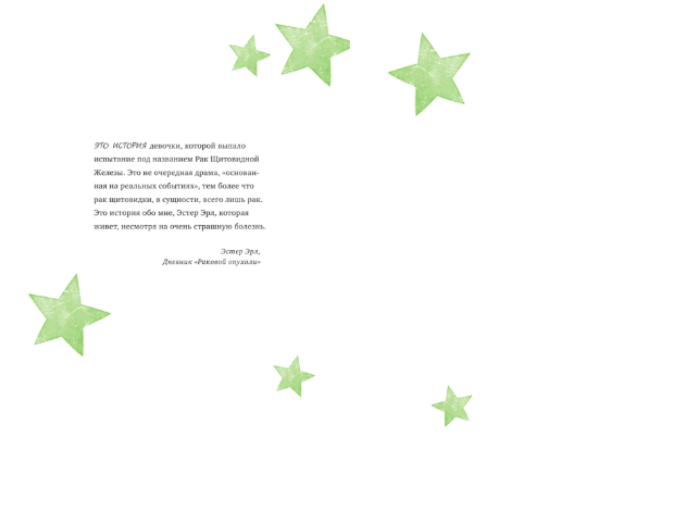 Эстер - в переводе с персидского «Звезда» - Эрл была яркой и талантливой, и при этом самой обыкновенной девочкой-подростком. В двенадцать лет ей поставили страшный диагноз - рак щитовидной железы. Но она продолжала жить интересной и насыщенной жизнью, с достоинством принимая свое физическое угасание. Жизнерадостная, оптимистичная, отважная дочь, сестра и подруга, Эстер умерла в 2010 году, вскоре после того как ей исполнилось шестнадцать, но прежде успела вселить надежду и вдохновить своим примером тысячи людей во всем мире. В этих уникальных мемуарах собраны дневники Эстер, ее фантазии, письма и зарисовки. Рассказать историю Эстер помогают фотографии и воспоминания родных и друзей. Со вступительным словом к читателю обращается лауреат литературной премии, известный писатель Джон Грин, который посвятил Эстер свой первый мировой бестселлер «Виноваты звезды».