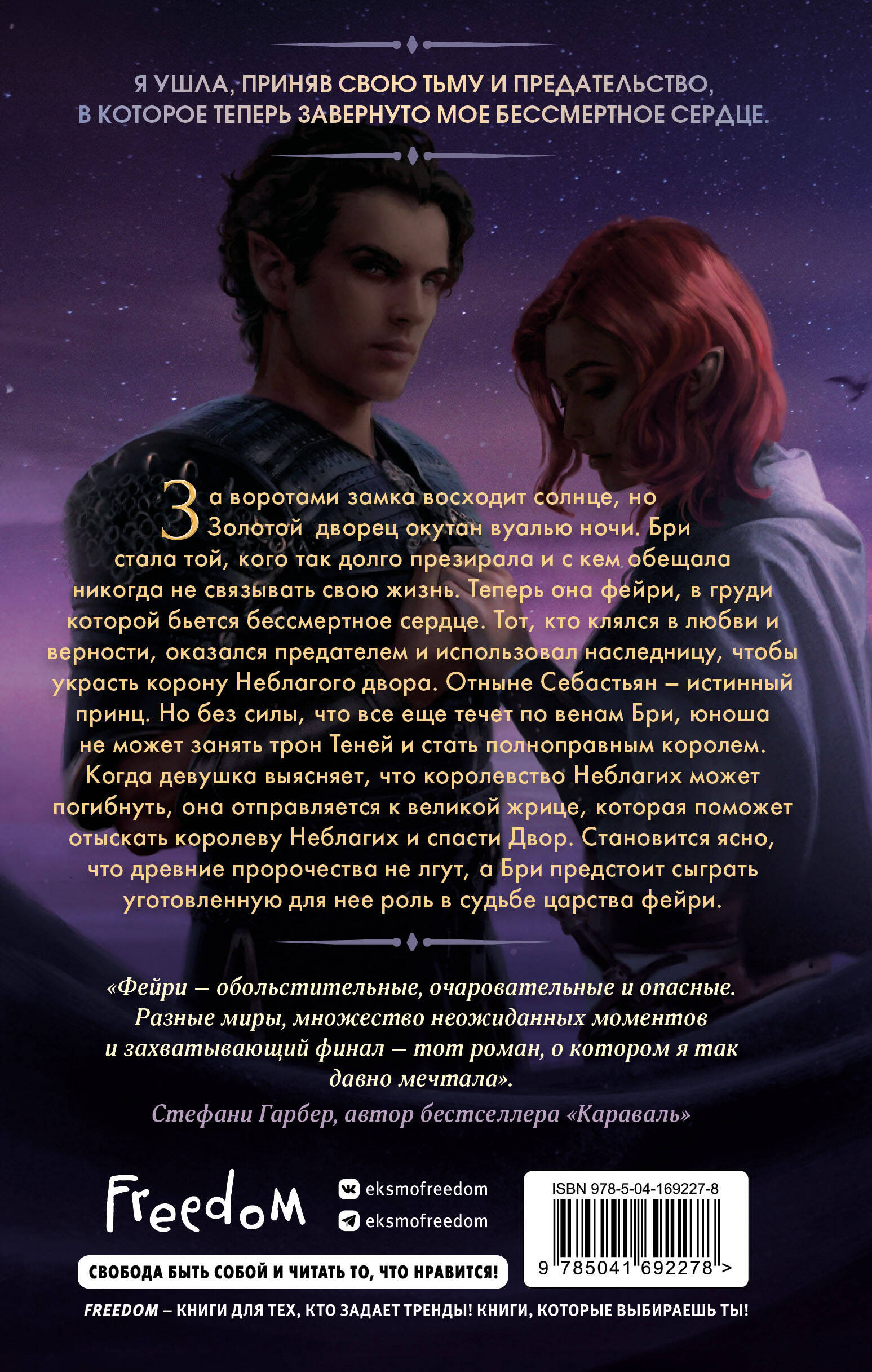 За воротами замка восходит солнце, но Золотой дворец окутан вуалью ночи. Бри стала той, кого так долго презирала и с кем обещала никогда не связывать свою жизнь. Теперь она фейри, в груди которой бьется бессмертное сердце. Тот, кто клялся в любви и верности, оказался предателем и использовал наследницу, чтобы украсть корону Неблагого двора. Отныне Себастьян истинный принц. Но без силы, что все еще течет по венам Бри, юноша не может занять трон Теней и стать полноправным королем. Когда девушка выясняет, что королевство Неблагих может погибнуть, она отправляется к великой жрице, которая поможет отыскать королеву Неблагих и спасти Двор. Становится ясно, что древние пророчества не лгут, а Бри предстоит сыграть уготовленную для нее роль в судьбе царства фейри. Продолжение романа «Эти лживые клятвы» от автора бестселлеров «New York Times» и обладательницы премии «RITA» в 2018 году. Ее романы разошлись тиражом более 725 000 копий в разных странах. Для всех поклонников мира фейри и бестселлеров Холли Блэк, чья серия «Воздушный народ» стала культовой. Фанаты историй о коварных, обольстительных существах и любви, граничащей с ненавистью, останутся в восторге. Коварные фейри, дворцовые интриги, любовный треугольник, борьба за престол. Долгожданное продолжение всеми полюбившегося романа. Когда-то давным-давно жила-была девочка с ярко-рыжими волосами, которой суждено было спасти королевство. Но кто теперь спасет ее от тьмы, что пробуждается внутри? Бри пережила предательство и… смерть. Тот, кому она безмерно доверяла, отнял корону ради трона Теней. Но без своей королевы Себастьян не сможет занять престол, ведь силы все еще остались у Бри и без боя он их не получит. «Бри - умная, сильная героиня из нового магического мира, за которой интересно наблюдать». - Лиза Максвелл, автор бестселлера New York Times «Последний маг»