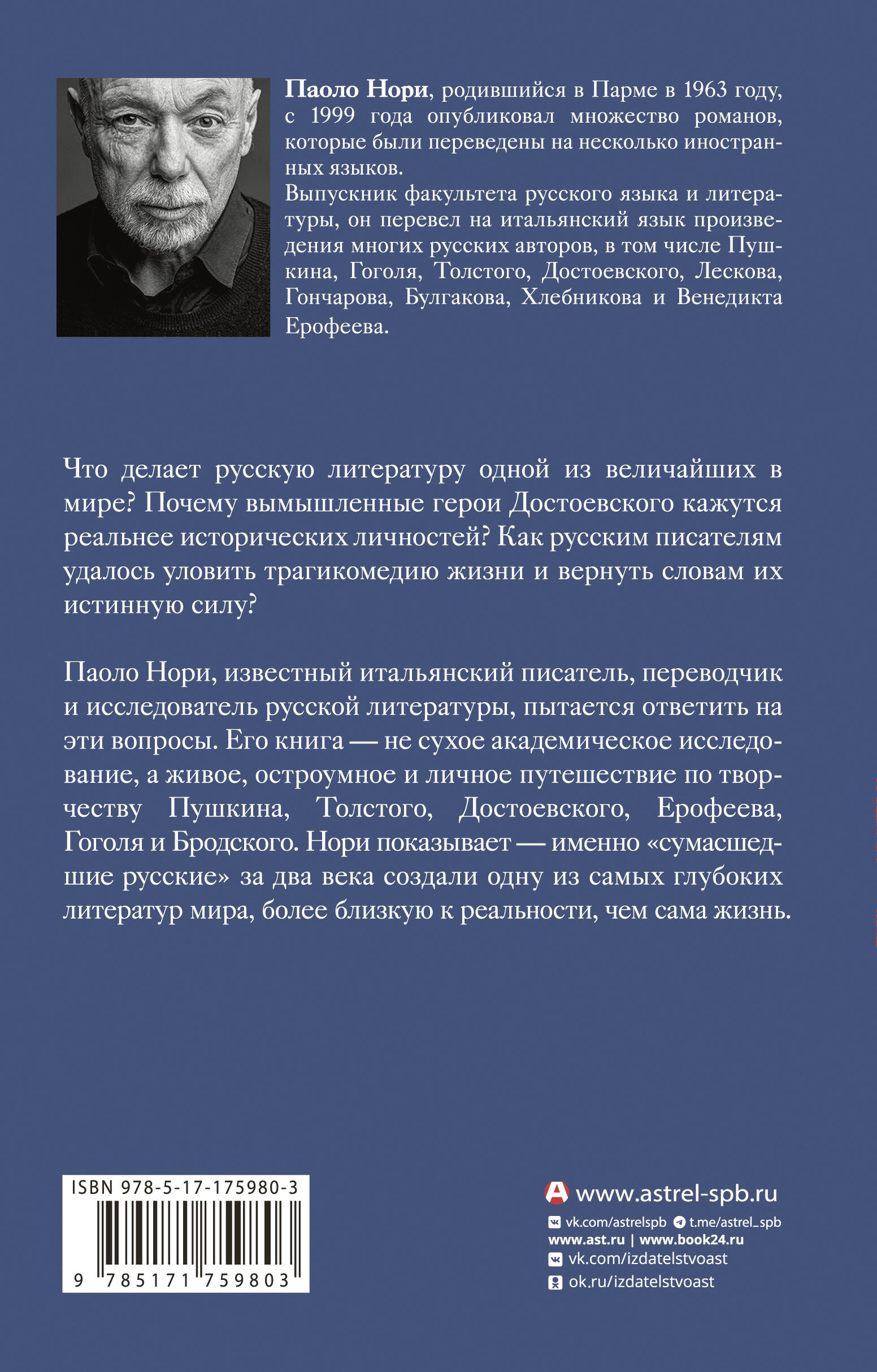 - Паоло Нори - современный итальянский писатель, переводчик, специалист по русской литературе. Перевел на итальянский язык произведения Пушкина, Толстого, Достоевского, Булгакова, Хлебникова и Венедикта Ерофеева. Автор книг «Невероятная жизнь Фёдора Михайловича Достоевского. Всё ещё кровоточит» и «Невероятная жизнь Анны Ахматовой. Мы и Анна Ахматова». - «Эти сумасшедшие русские. Краткий курс русской литературы 1820-1991» - это оригинальный взгляд на русскую литературу последних двух столетий глазами влюбленного в нее иностранца. Это живое, остроумное и очень личное путешествие по творчеству Достоевского и Пушкина, Гоголя, Толстого, Бродского и Ерофеева.| Издательство | Издательство "АСТ" |