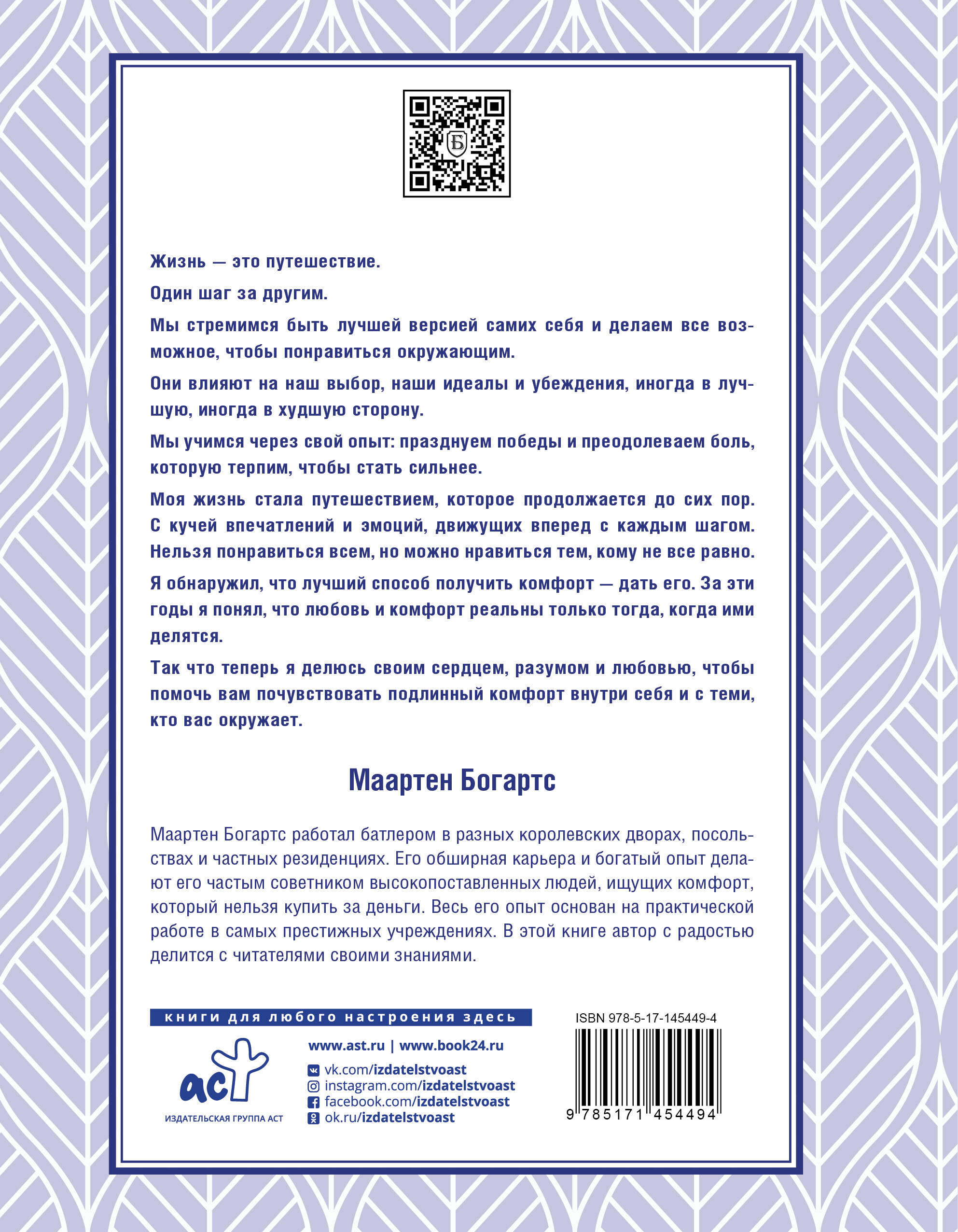 «Жизнь - это путешествие. Один шаг за другим. Мы стремимся быть лучшей версией самих себя и делаем все возможное, чтобы понравиться окружающим. Они влияют на наш выбор, наши идеалы и убеждения, иногда в лучшую, иногда в худшую сторону. Мы учимся через свой опыт: празднуем победы и преодолеваем боль, которую терпим, чтобы стать сильнее. Моя жизнь стала путешествием, которое продолжается до сих пор. С кучей впечатлений и эмоций, движущих вперед с каждым шагом. Нельзя понравиться всем, но можно нравиться тем, кому не все равно. Я обнаружил, что лучший способ получить комфорт - дать его. За эти годы я понял, что любовь и комфорт реальны только тогда, когда ими делятся. Так что теперь я делюсь своим сердцем, разумом и любовью, чтобы помочь вам почувствовать подлинный комфорт внутри себя и с теми, кто вас окружает». Маартен Богартс Маартен Богартс работал батлером в разных королевских дворах, посольствах и частных резиденциях. Его обширная карьера и богатый опыт делают его частым советником высокопоставленных людей, ищущих комфорт, который нельзя купить за деньги. Весь его опыт основан на практической работе в самых престижных учреждениях. В этой книге автор с радостью делится с читателями своими знаниями.