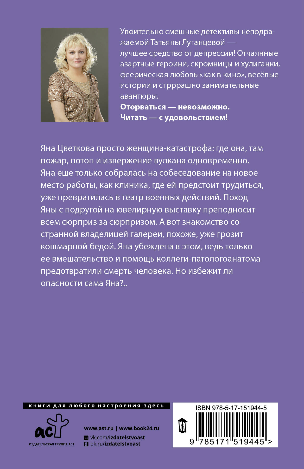 Яна Цветкова просто женщина-катастрофа: где она, там пожар, потоп и извержение вулкана одновременно. Яна еще только собралась на собеседование на новое место работы, как клиника, где ей предстоит трудиться, уже превратилась в театр военных действий. Поход Яны с подругой на ювелирную выставку преподносит всем сюрприз за сюрпризом. А вот знакомство со странной владелицей галереи, похоже, уже грозит кошмарной бедой. Яна убеждена в этом, ведь только ее вмешательство и помощь коллеги-патологоанатома предотвратили смерть человека. Но избежит ли опасности сама Яна?..| Издательство | ИЗДАТЕЛЬСТВО "АСТ" |