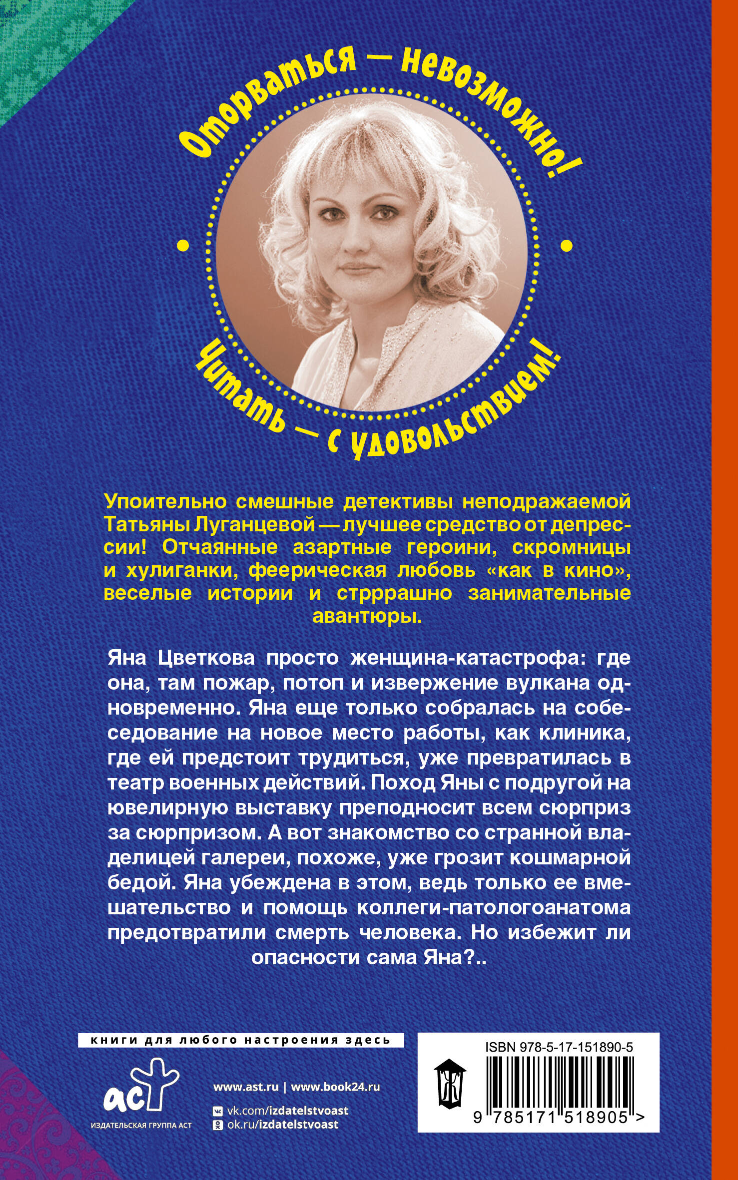 Яна Цветкова просто женщина-катастрофа: где она, там пожар, потоп и извержение вулкана одновременно. Яна еще только собралась на собеседование на новое место работы, как клиника, где ей предстоит трудиться, уже превратилась в театр военных действий. Поход Яны с подругой на ювелирную выставку преподносит всем сюрприз за сюрпризом. А вот знакомство со странной владелицей галереи, похоже, уже грозит кошмарной бедой. Яна убеждена в этом, ведь только ее вмешательство и помощь коллеги-патологоанатома предотвратили смерть человека. Но избежит ли опасности сама Яна?..| Издательство | ИЗДАТЕЛЬСТВО "АСТ" |