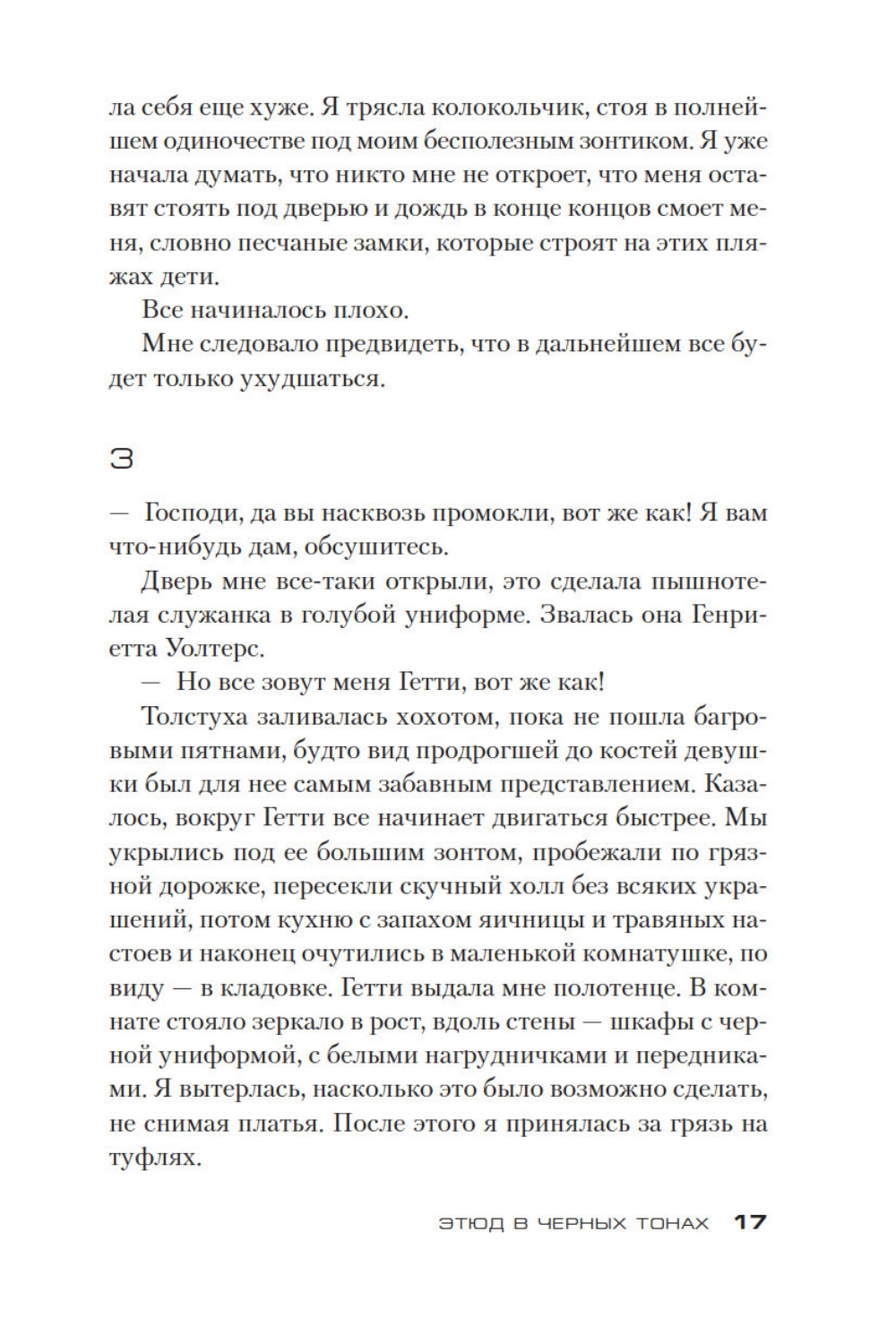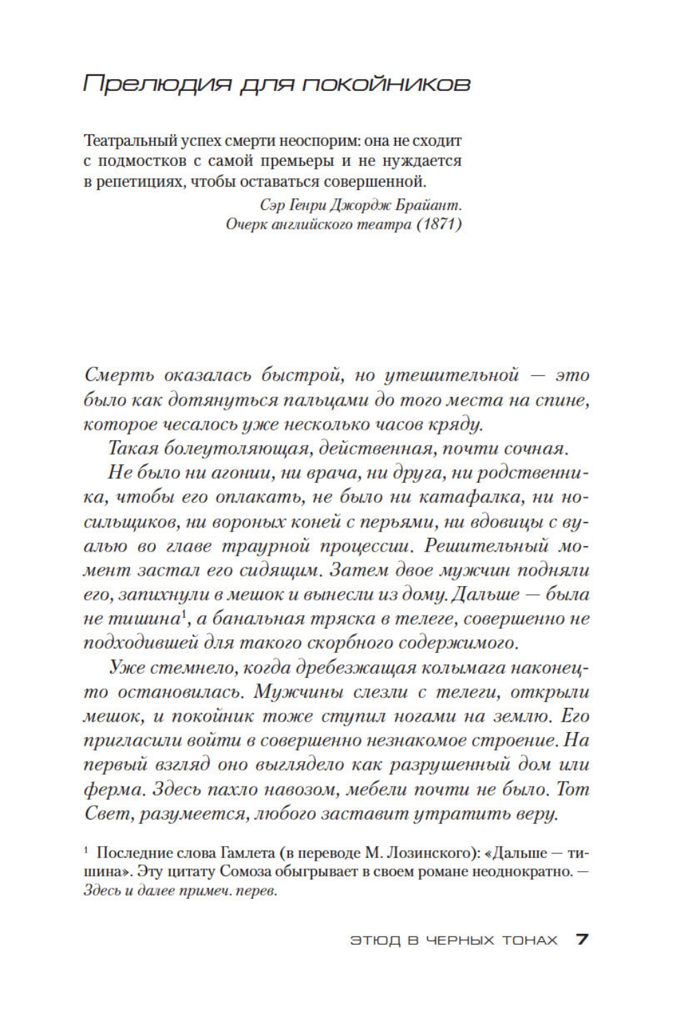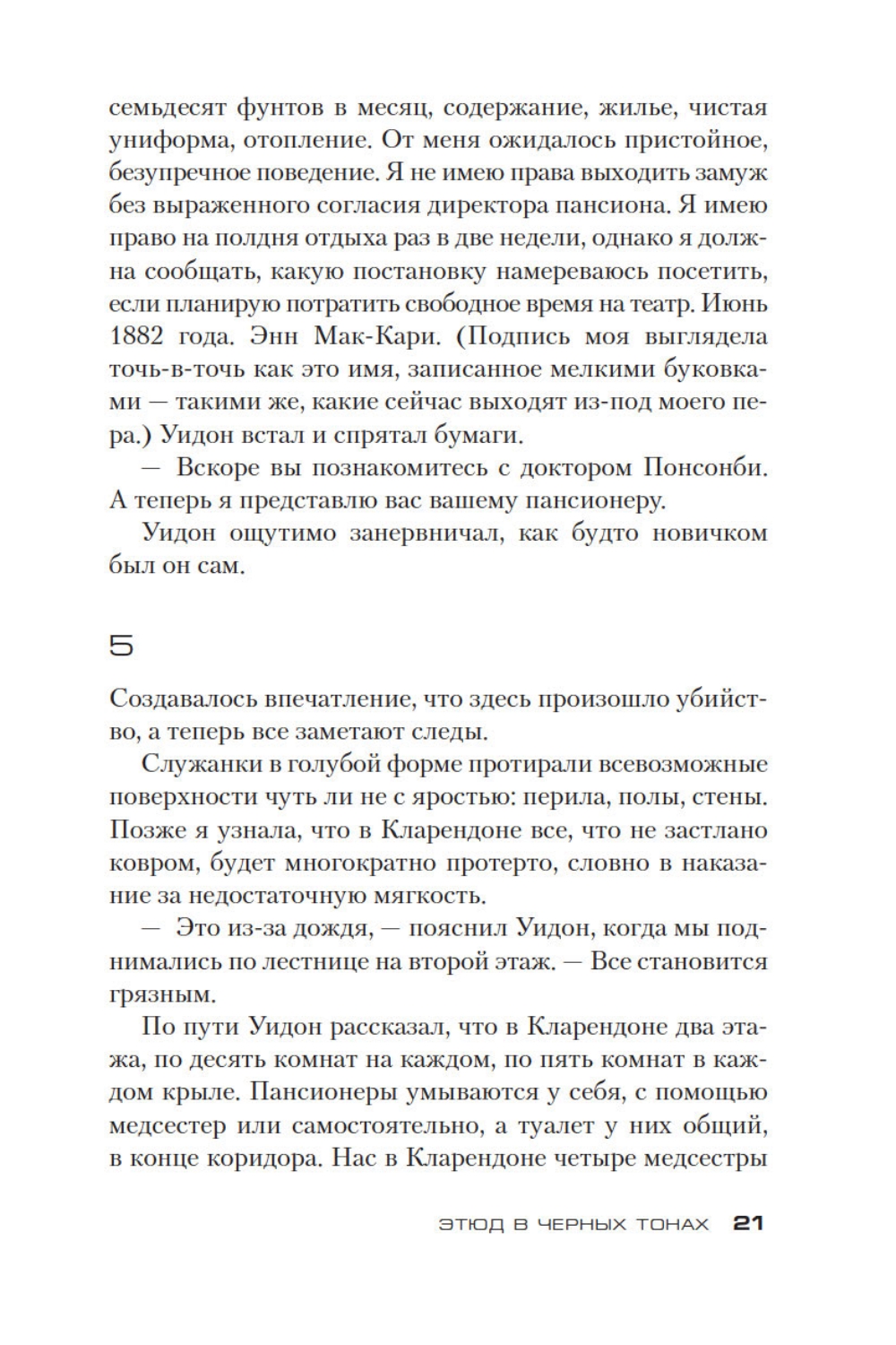 Хосе Карлос Сомоза - один из самых популярных испанских писателей, лауреат премии «Золотой кинжал» и множества других литературных премий (Silver Dagger Awards и Gold Dagger Awards, Nadal Prize, Cervantes Theatre Prize, Cafe Gijon Prize). В новом романе Сомозы «Этюд в черных тонах» все начинается в июне 1882 года, когда медсестра, Энн Мак-Кари, немолодая, некрасивая, незамужняя, прибывает в Портсмут, где она получила место в престижной клинике для душевнобольных Кларендон-Хаус. Ей поручают заботиться о загадочном джентльмене. Этот странный пациент велит называть себя мистер Икс, он не переносит дневного света, зато наделен необычайной проницательностью, для него нет ничего тайного в поступках людей, а расследовать преступления он может, не вставая с кресла. К этому дуэту присоединяется лондонский доктор Конан Дойл, только открывший практику. Тем временем в окрестностях клиники при загадочных обстоятельствах со странной периодичностью происходят несколько убийств. Полиция заходит в тупик, и кажется, единственный, кто способен раскрыть дело, - это мистер Икс, которого поддерживают только медсестра Энн и Дойл.