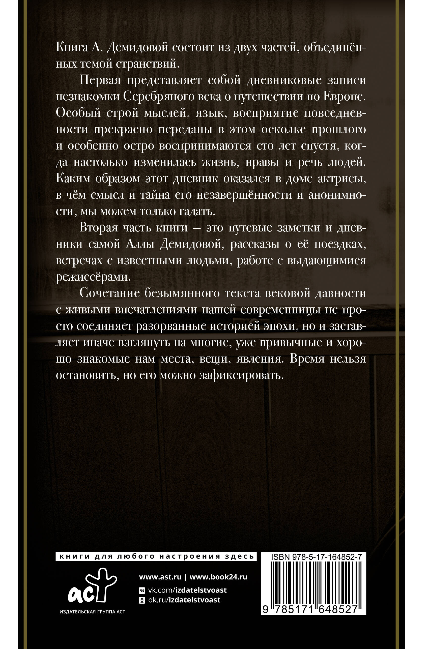Перед вами - книга из двух частей, объединенных темой странствий. В первой части - дневник рассказ незнакомки Серебряного века о путешествии по Европе. Особый строй мыслей, язык, восприятие повседневности прекрасно зафиксированы в этом осколке прошлого и особенно остро воспринимаются сто лет спустя, когда настолько изменилась жизнь, нравы, речь и восприятие мира. Когда, почему, зачем этот дневник оказался в доме актрисы, в чем смысл и тайна его незавершенности и анонимности - мы можем только гадать. Вторая часть - путевые заметки и дневники самой Аллы Демидовой, рассказы о ее поездках, встречах с интересными людьми, работе с выдающимися режиссерами. Сочетание безымянного текста вековой давности с живыми впечатлениями наших современников не просто соединяет разорванные историей эпохи, но и заставляет иначе взглянуть на многие уже привычные и хорошо знакомые нам места, вещи, явления. Время нельзя остановить, но его можно зафиксировать.| Издательство | Издательство "АСТ" |