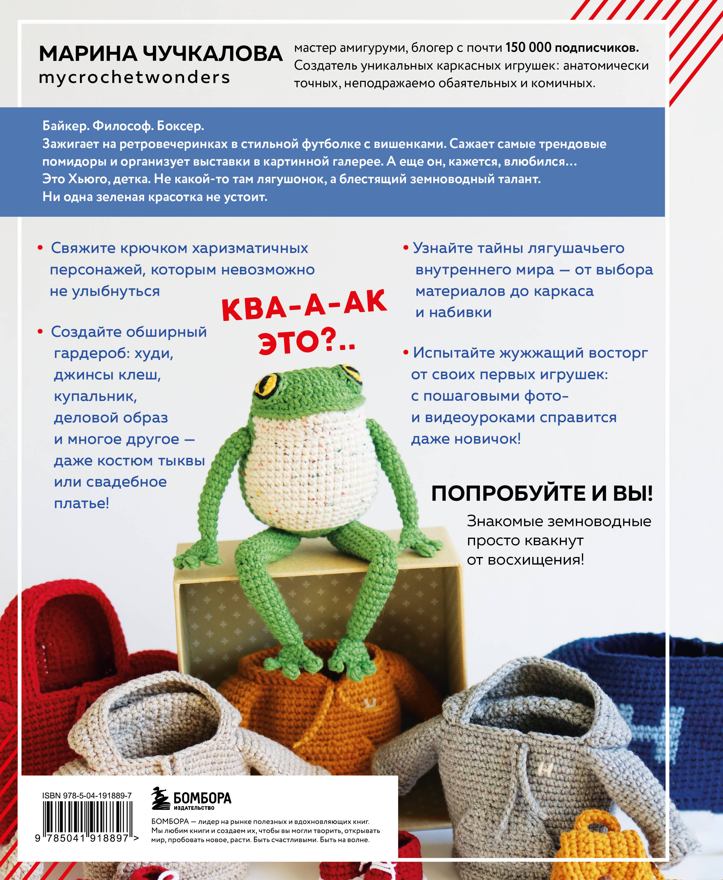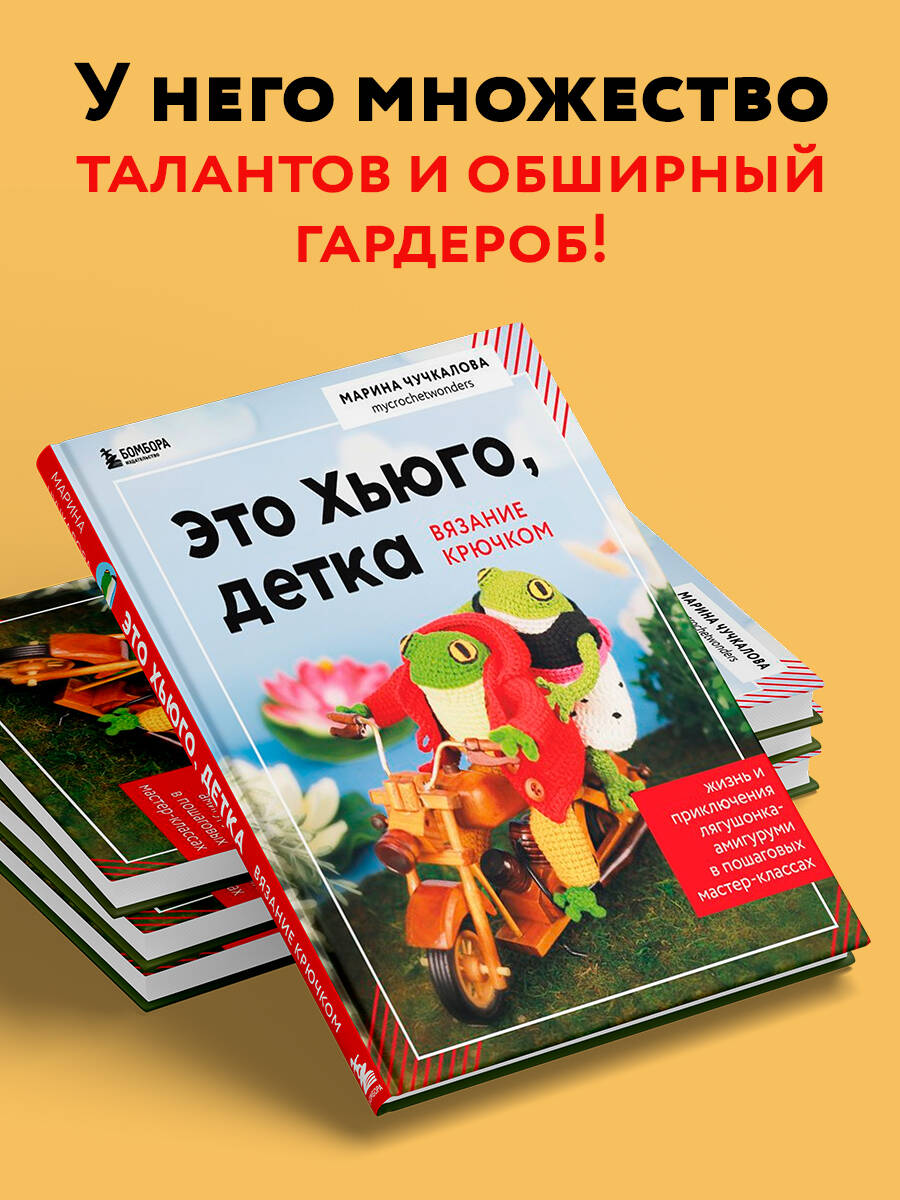Марина Чучкалова (mycrochetwonders) - мастер амигуруми, блогер с почти 150 тыс. подписчиков. Создатель уникальных каркасных игрушек, анатомически точных, неподражаемо обаятельных и комичных. Байкер. Философ. Боксер. Зажигает на ретро-вечеринках в стильной футболке с вишенками. Сажает самые трендовые помидоры и организует выставки в картинной галере. А еще он, кажется, влюбился… Это Хьюго, детка. Не какой-то там лягушонок, а блестящий земноводный талант. Ни одна зеленая красотка не устоит. Ква-а-ак это?.. • Связать крючком харизматичных персонажей, которым невозможно не улыбнуться. • Создать обширный гардероб: худи, джинсы-клеш, купальник, деловой образ и многое другое - даже костюм тыквы или свадебное платье! • Выведать тайны лягушачьего внутреннего мира - от выбора материалов до каркаса и набивки. • Испытать жужжащий восторг от своих первых игрушек: с пошаговыми фото- и видеоуроками справится даже новичок! Попробуйте и вы! Знакомые земноводные просто квакнут от восхищения!| Издательство | ООО "Издательство "Эксмо" |