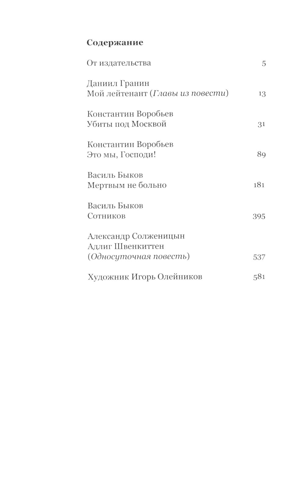 Книга посвящена 70-летию Победы в Великой Отечественной войне. Все авторы про-изведений - писатели-фронтовики: Василь Быков, Константин Воробьев, Александр Солженицын, Даниил Гранин, Виктор Астафьев. Повести и рассказы участников войны - о человеке один на один со смертью, когда даже неверующие души вспоминают своего Творца и взывают к Нему. Это дошедшие до нас голоса солдат из окопов, их личный фронтовой опыт. Для этой книги известный художник Игорь Олейников создал 35 уникальных рисунков. Книга для взрослых с иллюстрациями - прекрасный подарок всем любителям художественной литературы. И прежде всего - подарок для всех, кто хочет знать и не забывать правду о войне. Допущено к распространению Издательским советом Русской Православной Церкви. «ИС Р15-501-0007»| Издательство | Изд. НИКЕЯ |