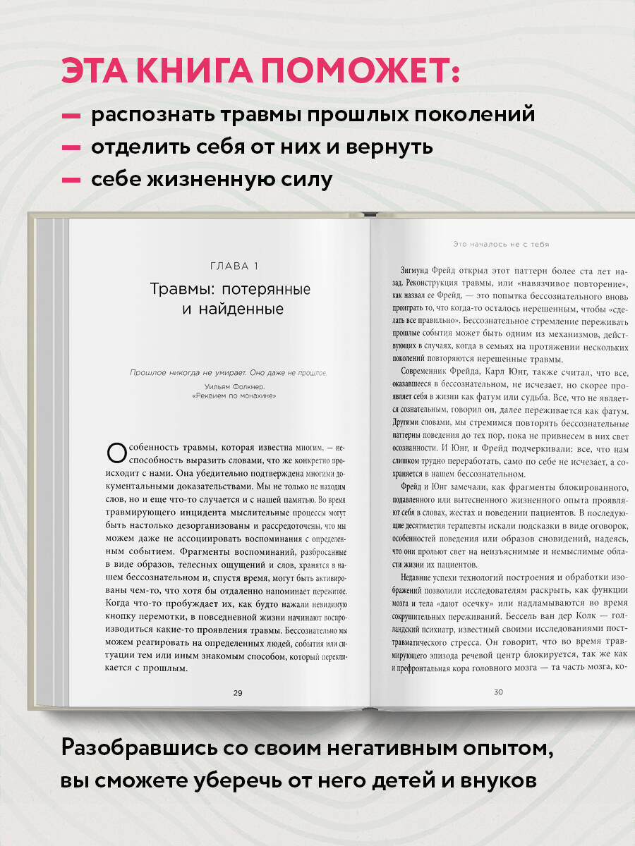 БОЛЕЕ 7000 ВОСТОРЖЕННЫХ ОТЗЫВОВ НА АМАЗОН! ПЕРЕВЕДЕНА НА 20 ЯЗЫКОВ! В РОССИИ ПРОДАНО БОЛЕЕ 55 000 ЭКЗЕМПЛЯРОВ! Депрессия, тревога, страхи, хронические боли, навязчивые мысли, которые отравляют нам жизнь... Помните ли, когда впервые столкнулись с ними? Возможно, что-то подобное переживали наши родители или дальние родственники? Каждый ребенок подсознательно несет отпечаток привычек и установок своих родных. Фрагменты их жизненного опыта, воспоминания, ощущения, переживания продолжают жить в нас, требуя своих решений. Ведущий специалист по работе с психологической травмой Марк Уолинн предлагает техники, которые помогут соединить в целое отдельные эмоции и события прошлого, тревожащие нас сегодня. Изучите сценарии, которые передаются в семье из поколения в поколение, и начните новую осознанную и счастливую жизнь. Из этой книги вы узнаете: - что такое наследственная травма и как она влияет на новые поколения; - как определить, чьи страхи и страдания вы на самом деле переживаете; - как наследственные травмы влияют на гены и как изменить это влияние; - как неразрешенные семейные травмы влияют на отношения с партнером и финансовый успех; - как восстановить прерванную связь с родителями, даже если они умерли; - что делать для того, чтобы избавить себя и своих детей от наследственных травм; - как вернуться к здоровой, полноценной и успешной жизни без страха и страданий.| Издательство | ООО "Издательство "Эксмо" |