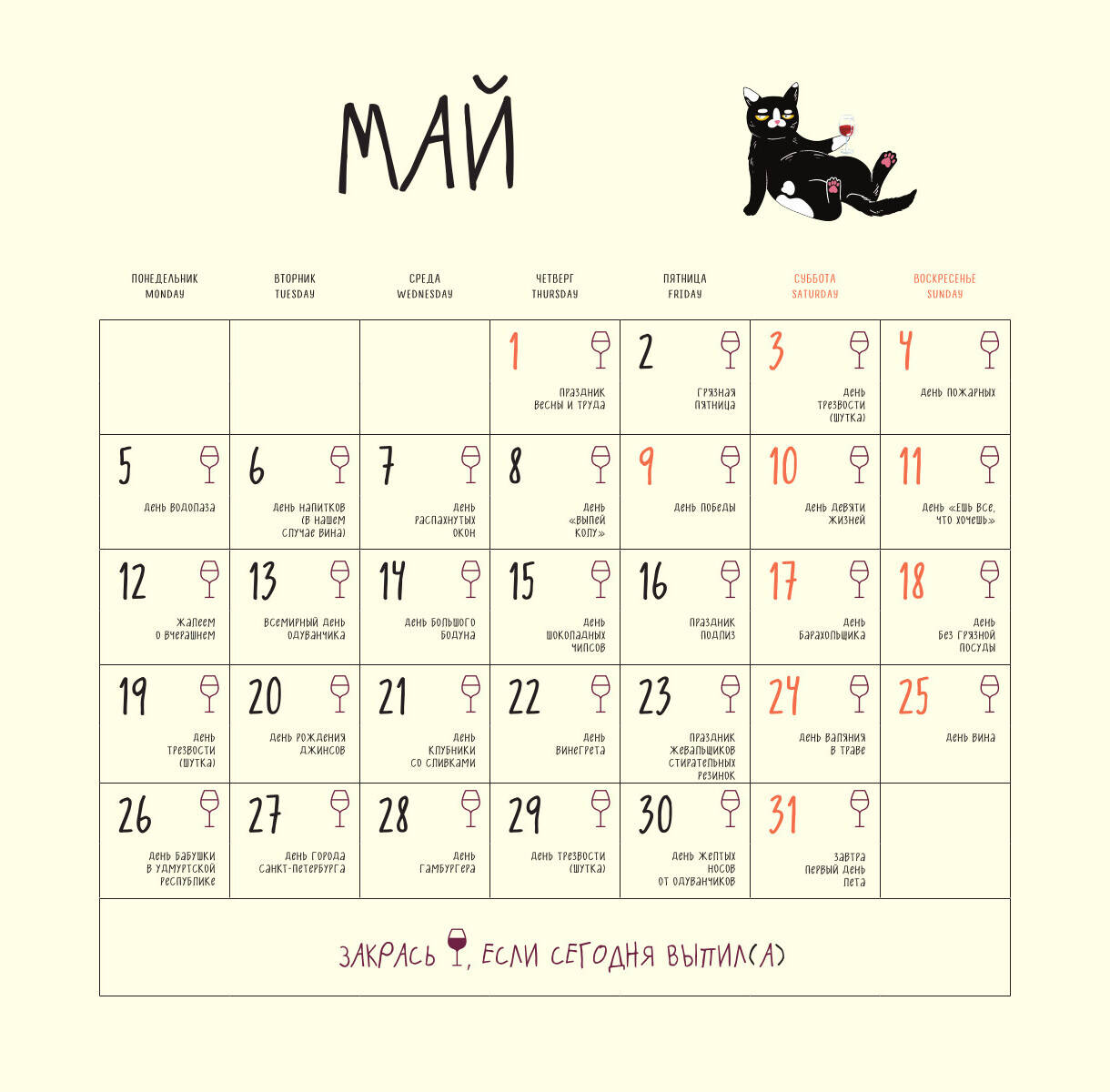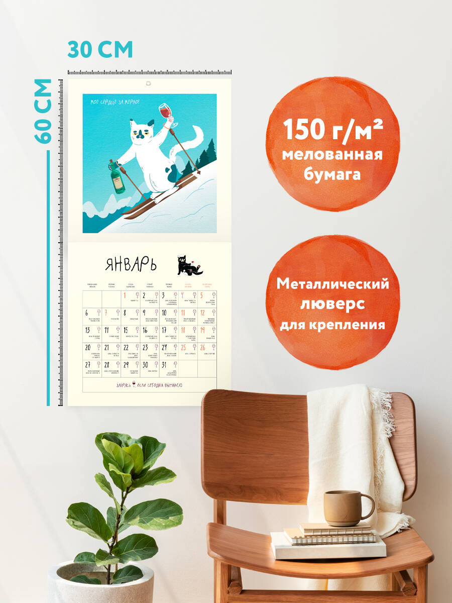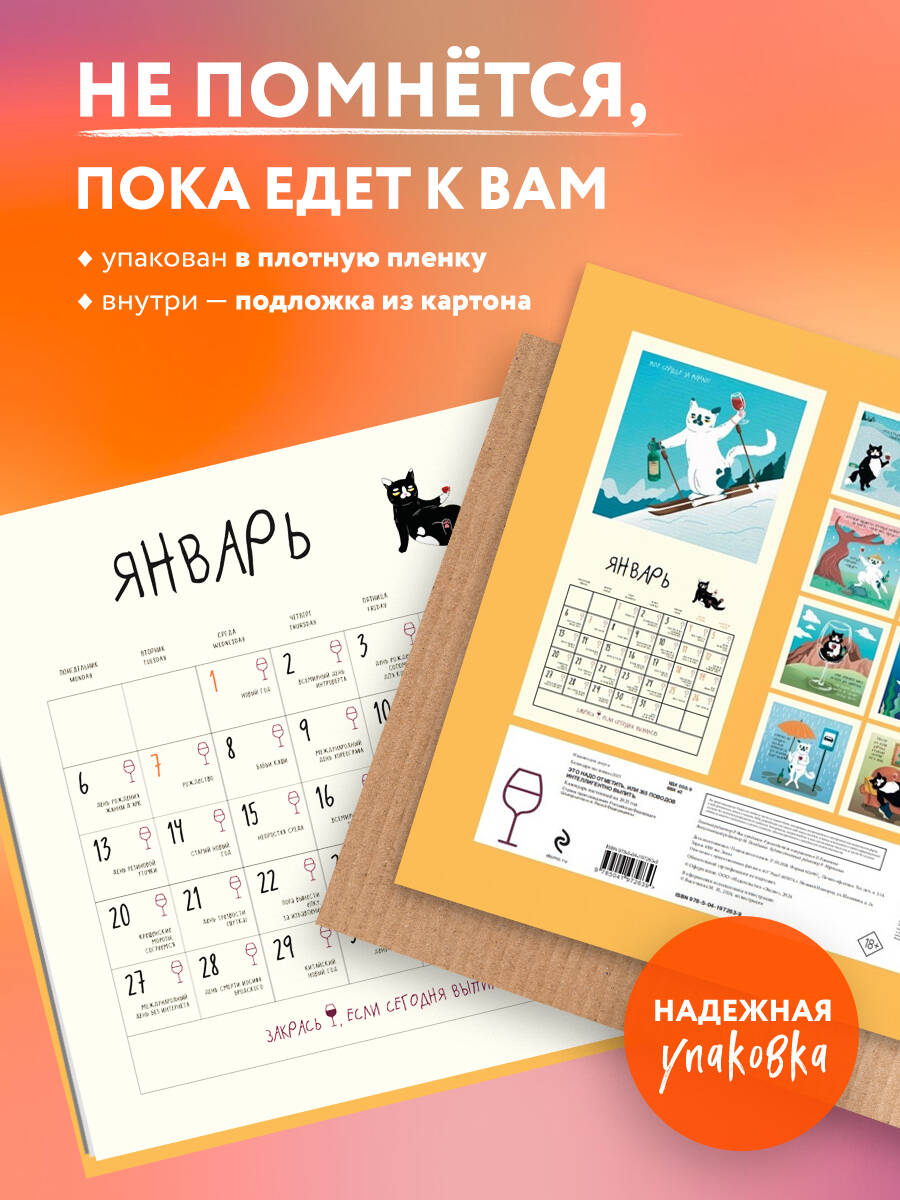 Наши настенные календари отличаются высоким качеством исполнения! Тщательно подобранные иллюстрации, напечатанные на глянцевой бумаге высочайшего качества, станут настоящим украшением дома, а в календарной сетке найдется место для ваших планов: большие клетки позволят делать записи и организовать свой год! В серии настенных календарей издательства «ЭКСМО» каждый найдет тему по вкусу: великие художники, великолепные подборки с самыми знаменитыми произведениями искусства, легендарные кинематографические саги и игры, главные книжные авторы и бестселлеры, фотографии и иллюстрации любимых животных и многое-многое другое! Календарь для любителей винишка и котиков. На каждом развороте - шутка про вино и стильный рисунок смешного кота с покер-фейсом. В сетке каждый день - символ бокала, чтобы помечать дни, когда пил, и повод выпить: первая пятница года, день бармена, начало Октоберфеста и т.д. Технические параметры: - Тип календаря - настенный перекидной. - Год - 2025. - Календарная сетка - с разбивкой по месяцам. - Вид скрепления - скрепка. - Ширина - 30 см. - Высота - 30 см. - Внутренний блок - мелованная бумага 150 г/м2. - Подложка - плотный гофрокартон для поддержания формы. - Индивидуальная упаковка в плотный целлофановый пакет.