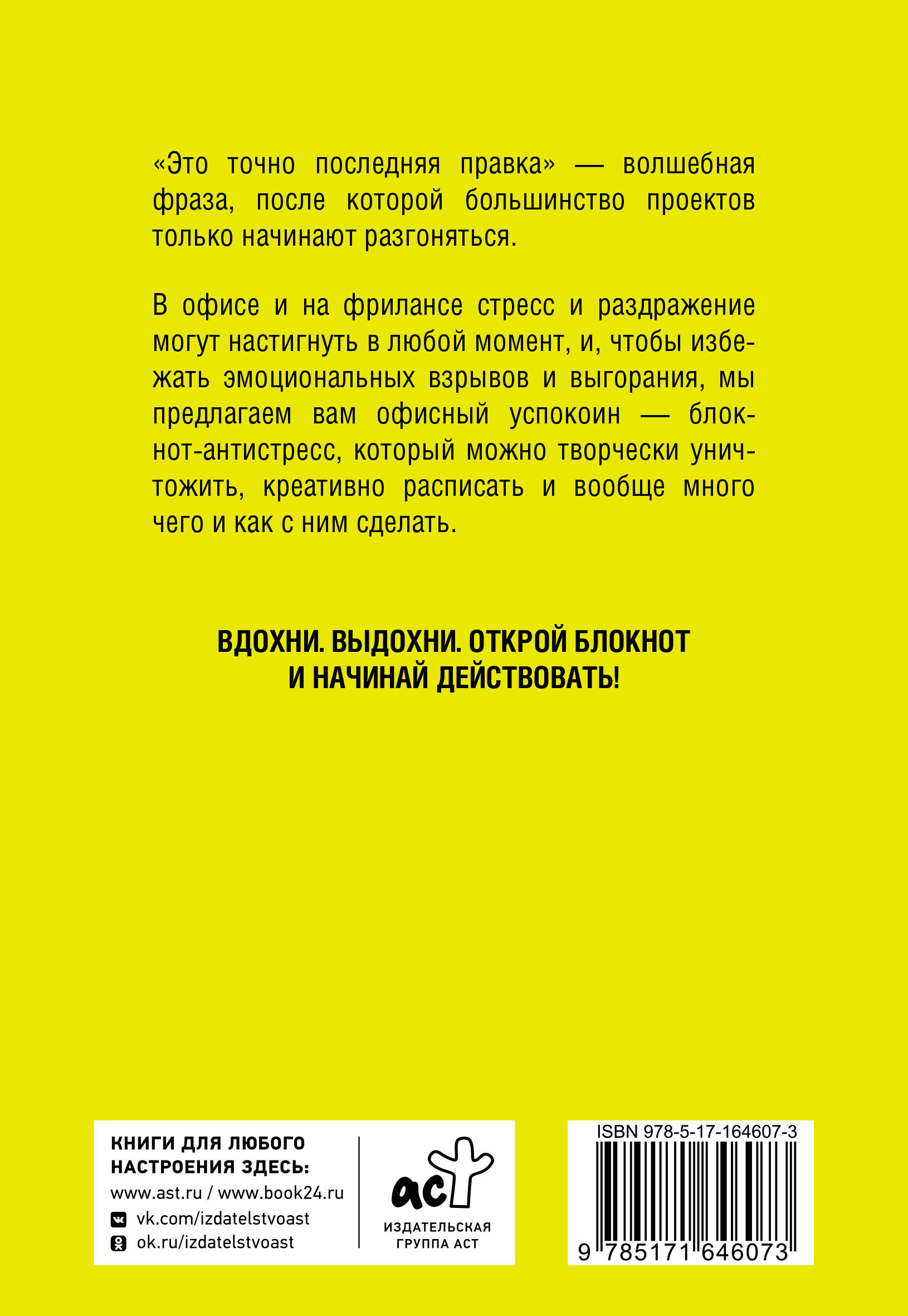 "Это точно последняя правка" - волшебная фраза, после которой большинство проектов только начинают разгоняться. В офисе и на фрилансе стресс и раздражение могут настигнуть в любой момент, и, чтобы избежать эмоциональных взрывов и выгорания, мы предлагаем вам офисный успокоин - блокнот-антистресс, который можно творчески уничтожить, креативно расписать и вообще много чего и как с ним сделать.| Издательство | Издательство "АСТ" |
