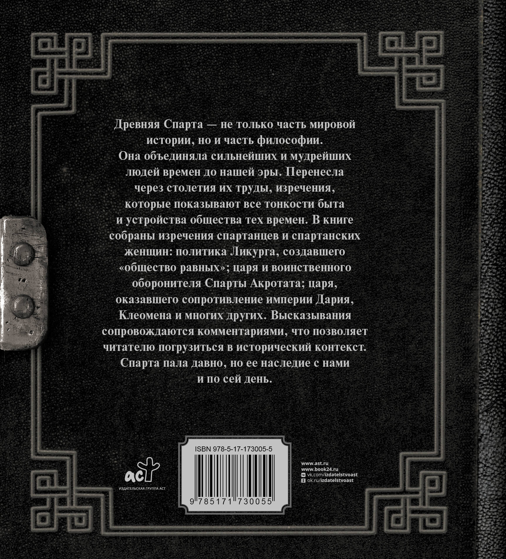 Древняя Спарта - не только часть мировой истории, но и часть философии. Она объединяла сильнейших и мудрейших людей времен до нашей эры. Перенесла через столетия их труды, изречения, которые показывают все тонкости быта и устройства общества тех времен. В книге собраны изречения спартанцев и спартанских женщин: политика Ликурга, создавшего "общество равных"; царя и воинственного оборонителя Спарты Акротата; царя, оказавшего сопротивление империи Дария, Клеомена и многих других. Высказывания сопровождаются комментариями, что позволяет читателю погрузиться в исторический контекст. Спарта пала давно, но ее наследие с нами и по сей день.| Издательство | Издательство "АСТ" |