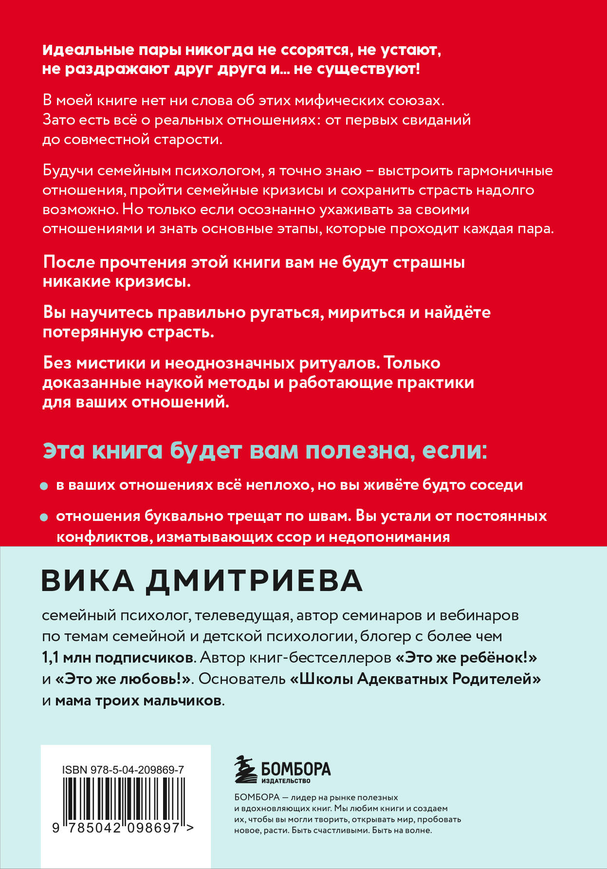 Вика Дмитриева - душевный психолог, которому доверяют миллионы. Семейный психолог, блогер и известная телеведущая. Жена и мама троих детей. Всего у нее уже выпущено более 380 000 книг. Идеальные пары не ссорятся, не устают, не раздражают друг друга и не существуют. В своей книге Вика Дмитриева пишет о том, с чем сталкиваются пары и что происходит с отношениями: от зарождения до угасания страсти. Вы узнаете: • как понять, подходите ли вы друг другу; • что происходит с любовью, когда исчезают «бабочки в животе»; • что нужно успеть до вступления в брак; • что такое настоящая, а не отфотошопленная семейная жизнь. Кто в семье главный? Как делить бюджет? Можно ли назначить свидание... собственному мужу? Долго и счастливо - это везение, судьба или все же результат определенной работы? Вика Дмитриева дает проверенные психологические практики и работающие советы из жизни. В это издание добавлено еще больше техник и упражнений для разрешения конфликтов и сближения с партнером. Вы найдете советы, как сохранить близость спустя время, а также интересные идеи для свиданий и романтических сюрпризов.