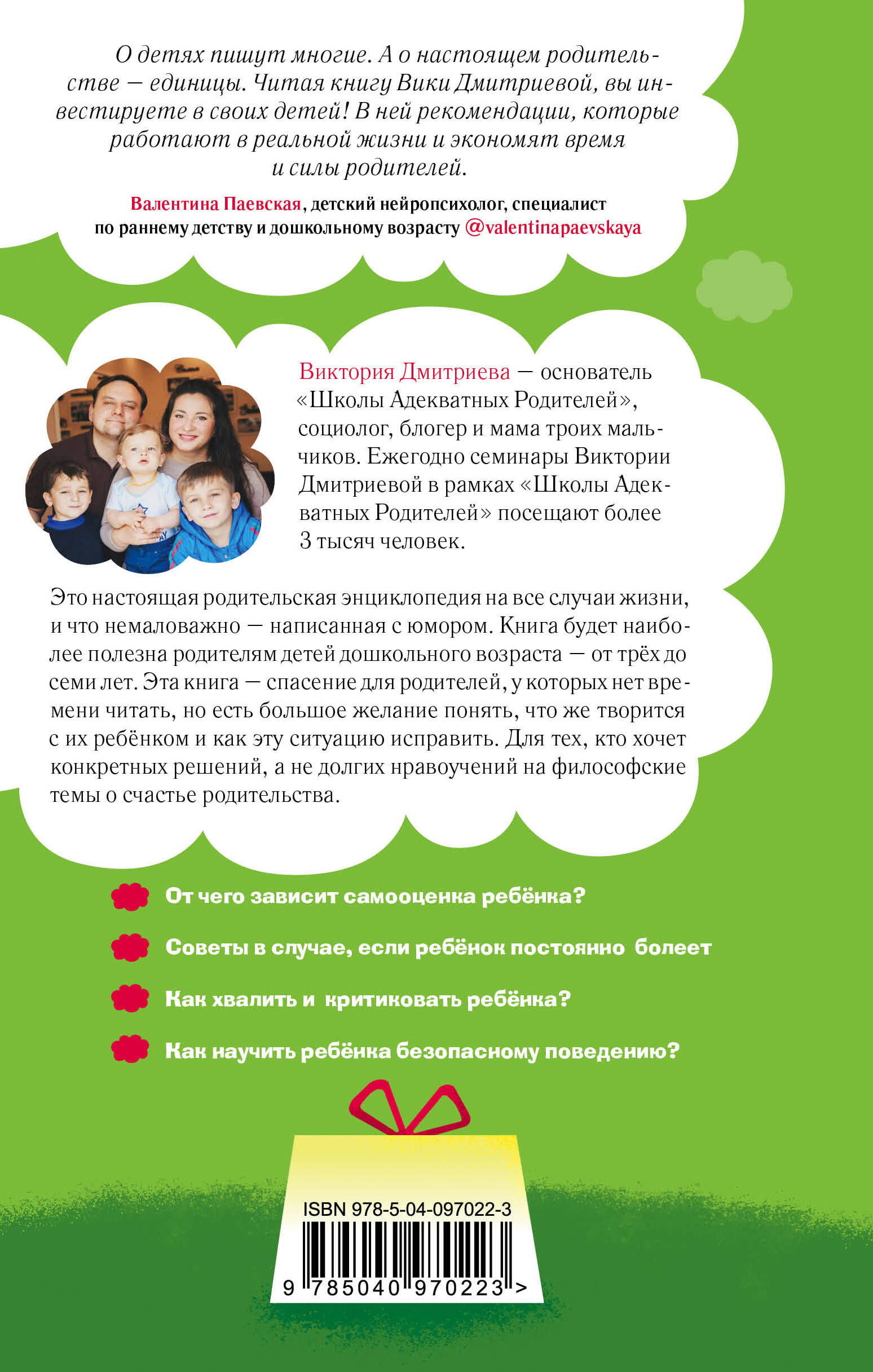 Настоящая родительская энциклопедия на все случаи жизни, и что немаловажно - написанная с юмором. Книга будет наиболее полезна родителям детей дошкольного возраста - от трех до семи лет. Эта книга - спасение для родителей, у которых нет времени читать, но есть большое желание понять, что же творится с его ребенком и как эту ситуацию исправить. Для тех, кто хочет конкретных решений, а не долгих нравоучений на философские темы о счастье родительства.