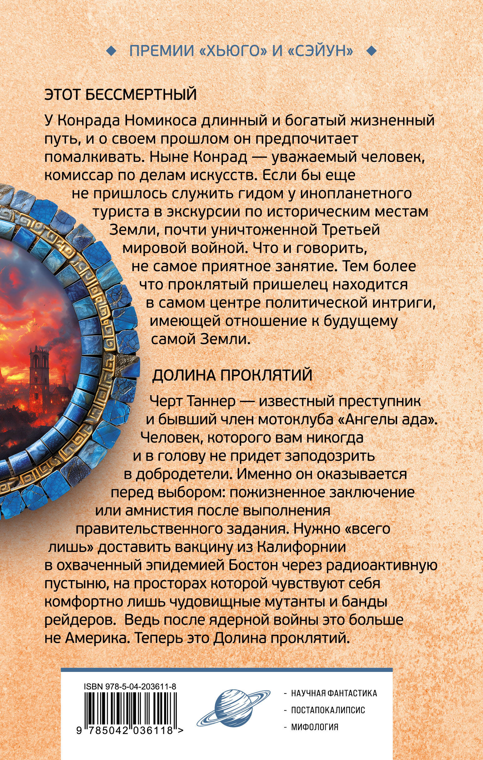 Премия «Хьюго», премия Сэйун, премия Геффена. «Этот бессмертный» Мир после Третьей мировой войны. Города разрушены, а в радиоактивных пустошах обитают мутанты. Люди почти полностью эмигрировали на другие планеты, и Земля стала модным туристическим центром для богачей из других уголков Вселенной. Конрад Номикос, комиссар по делам культуры и человек с таинственным прошлым, вынужден быть гидом у инопланетного вельможи в его путешествии, результат которого, возможно, спасет или уничтожит планету. «Долина проклятий» Черт Таннер - не из тех, кого можно принять за героя: он автоугонщик, контрабандист и хладнокровный убийца. Вы также никогда не подумаете, что Черт Таннер гуманист. За различные преступления ему грозит пожизненное заключение, и он поставлен перед выбором: провести оставшиеся годы в крошечной тюремной камере или проехать через всю страну и доставить в Бостон контейнер с вакциной… если, конечно, там еще кто-то остался в живых. Но не принимайте эту миссию милосердия за обычное дорожное путешествие - не сейчас, когда на каждой смертоносной миле между Лос-Анджелесом и Восточным побережьем вас ждут радиоактивные бури, стаи хищных мутантов и банды рейдеров. Это уже не Америка. Это долина проклятий. «Яркий и полный скрытых смыслов… Если вы когда-нибудь задавали себе вопрос, что бы произошло, если бы Филип Марлоу был Одиссеем… то вот подсказка к ответу». - New Worlds «Роджер Желязны - лучший автор Новой волны, настолько смелый, что я не могу сказать ничего, чтобы не обидеть консерваторов… Писатель настолько же сильный, насколько поражающий размахом своих сюжетов и образов». - Дэвид Брин