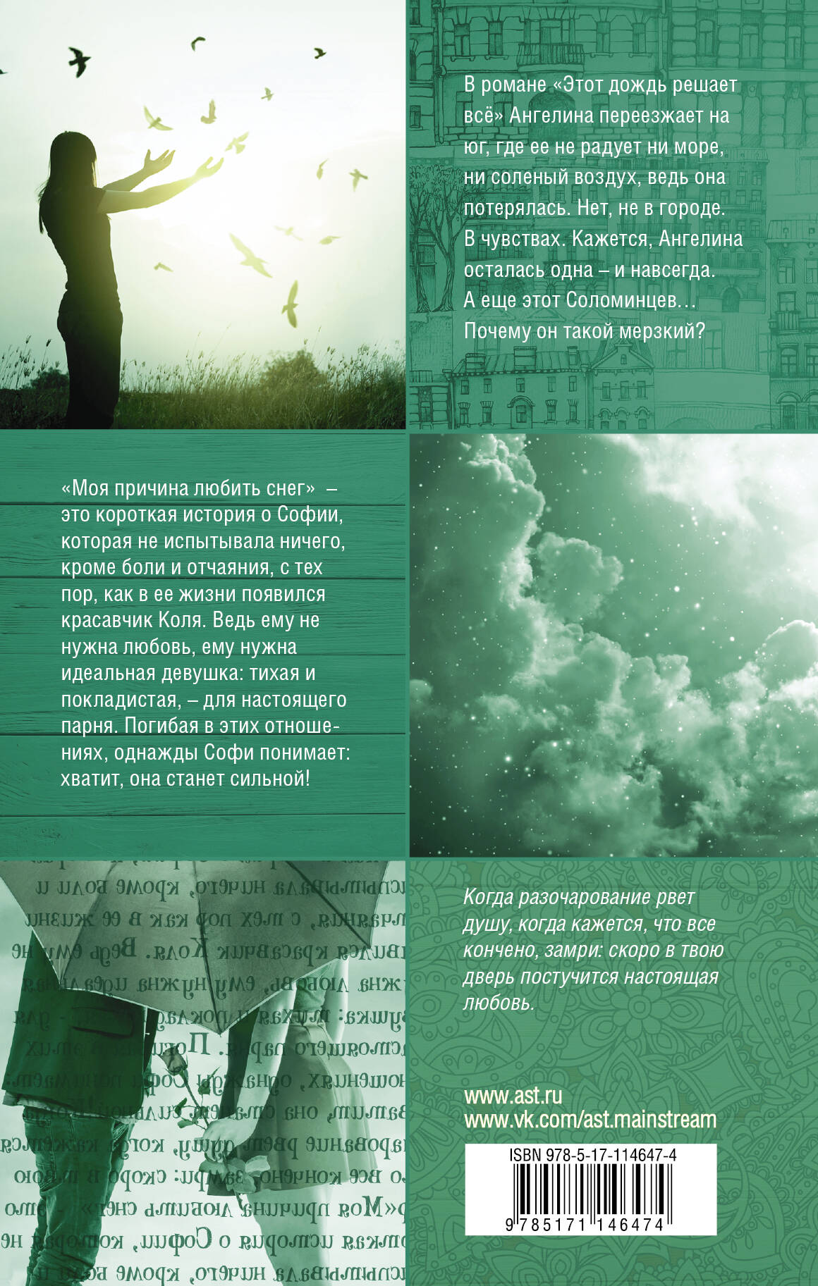 В романе "Этот дождь решает все" Ангелина переезжает на юг, где ее не радует ни море, ни соленый воздух, ведь она потерялась. Нет, не в городе. В чувствах. Кажется, Ангелина осталась одна - и навсегда. А еще этот Соломинцев… Почему он такой мерзкий? "Моя причина любить снег" - это короткая история о Софии, которая не испытывала ничего, кроме боли и отчаяния, с тех пор как в ее жизни появился красавчик Коля. Ведь ему не нужна любовь, ему нужна идеальная девушка: тихая и покладистая, - для настоящего парня. Погибая в этих отношениях, однажды Софи понимает: хватит, она станет сильной! Когда разочарование рвет душу, когда кажется, что все кончено, замри: скоро в твою дверь постучится настоящая любовь.| Издательство | ИЗДАТЕЛЬСТВО "АСТ" |