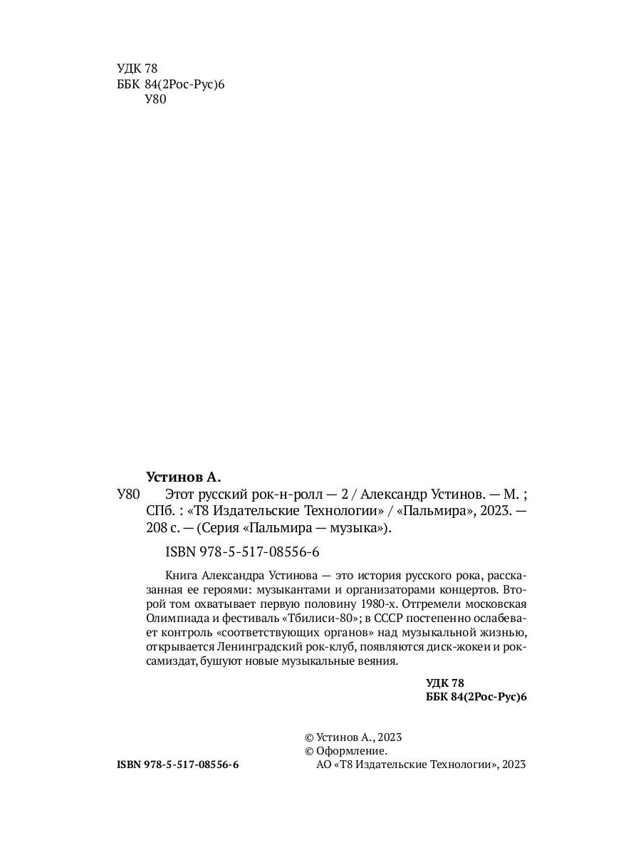 Александр Устинов - петербургский журналист, радио- и телеведущий. Эта книга - история русского рока, рассказанная ее героями: музыкантами и организаторами концертов. Второй том охватывает первую половину 1980-х. Отгремели московская Олимпиада и фестиваль Тбилиси-80; в СССР постепенно ослабевает контроль "соответствующих органов" за музыкальной жизнью, открывается Ленинградский рок-клуб, появляются диск-жокеи и рок-самиздат, бушуют новые музыкальные веяния.