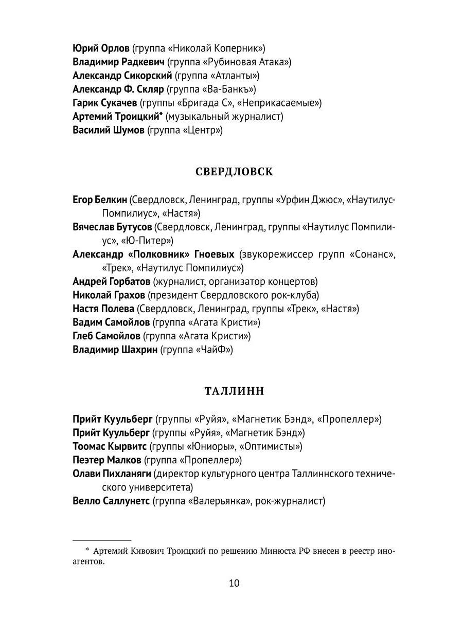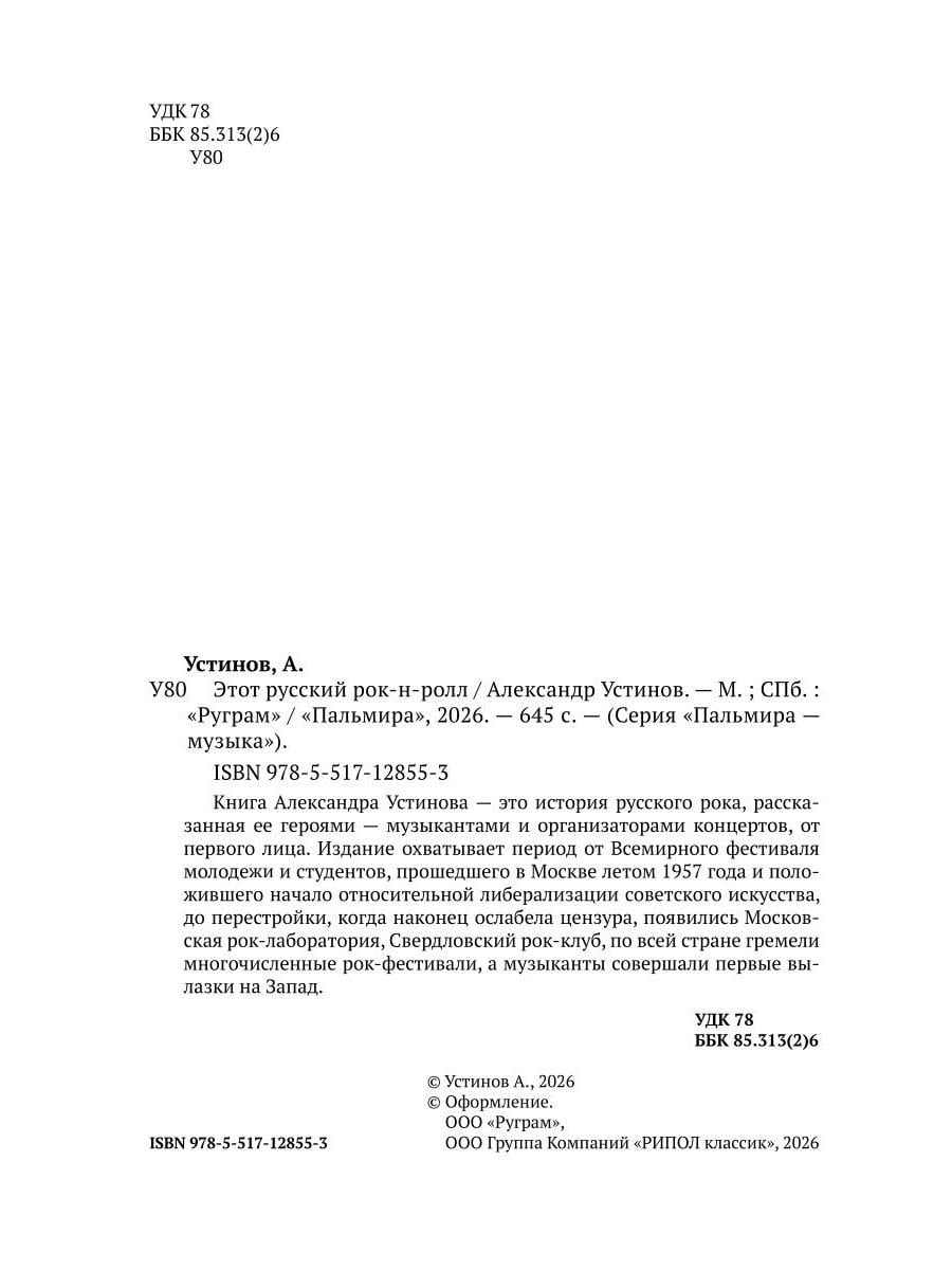 СОДЕРЖИТ ИНФОРМАЦИЮ О НАРКОТИЧЕСКИХ ИЛИ ПСИХОТРОПНЫХ ВЕЩЕСТВАХ, УПОТРЕБЛЕНИЕ КОТОРЫХ ОПАСНО ДЛЯ ЗДОРОВЬЯ. ИХ НЕЗАКОННЫЙ ОБОРОТ ВЛЕЧЕТ УГОЛОВНУЮ ОТВЕТСТВЕННОСТЬ. Книга Александра Устинова - это история русского рока, рассказанная ее героями - музыкантами и организаторами концертов, от первого лица. Издание охватывает период от Всемирного фестиваля молодежи и студентов, прошедшего в Москве летом 1957 года и положившего начало относительной либерализации советского искусства, до перестройки, когда наконец ослабела цензура, появились Московская рок-лаборатория, Свердловский рок-клуб, по всей стране гремели многочисленные рок-фестивали, а музыканты совершали первые вылазки на Запад.| Издательство | Т8 RUGRAM |