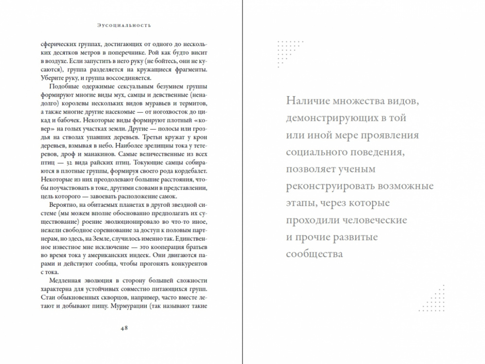 «Эусоциальность» - краткая, но емкая новаторская работа, включающая не только современные представления об эволюционной теории, но и оригинальные биологические и гуманистические идеи, которыми славится Эдвард Уилсон.