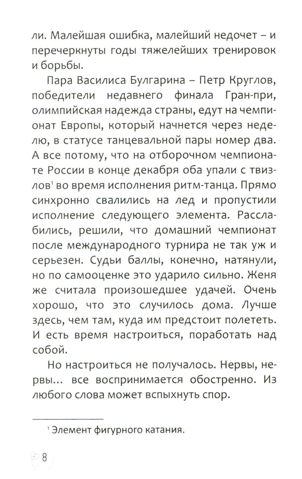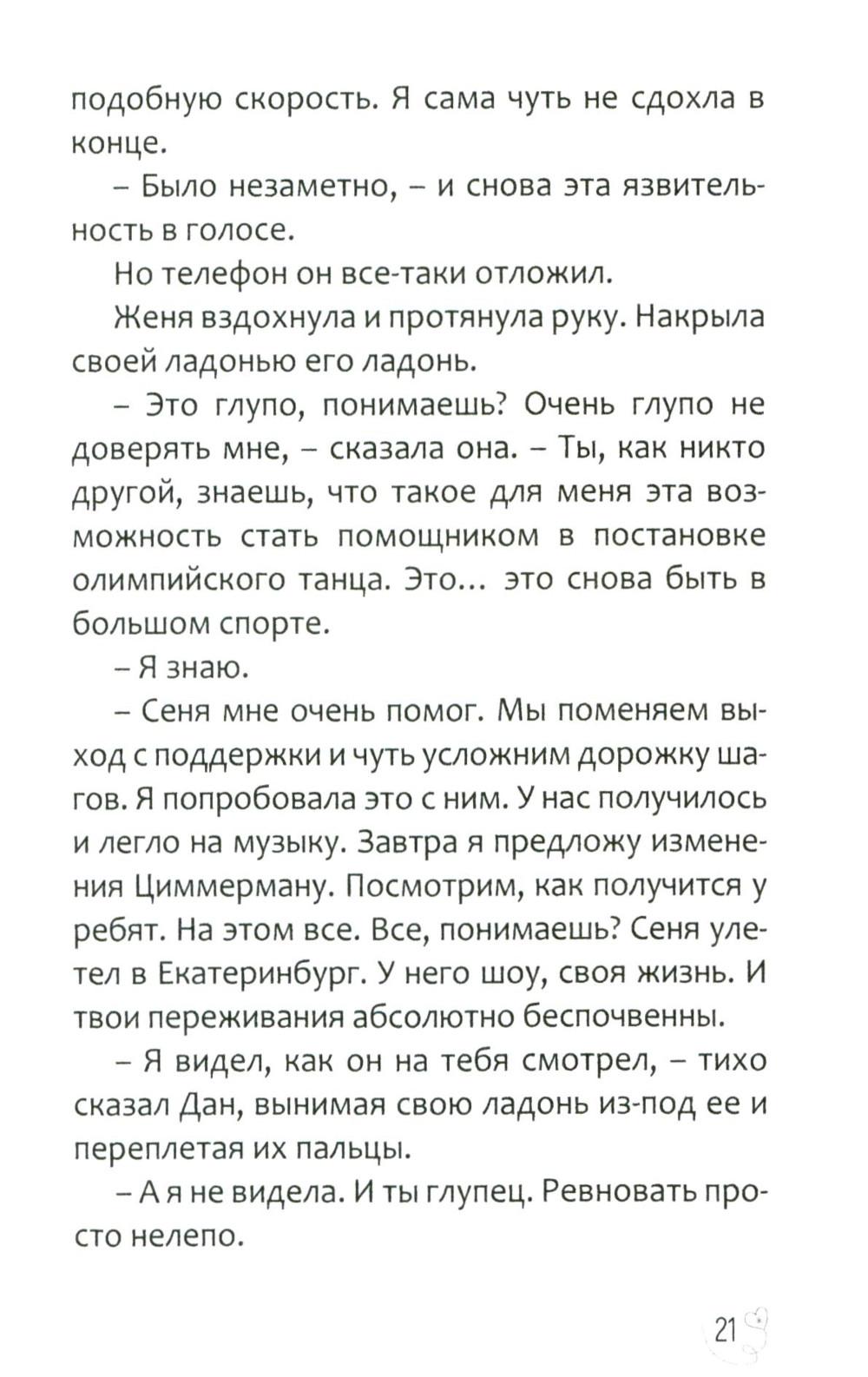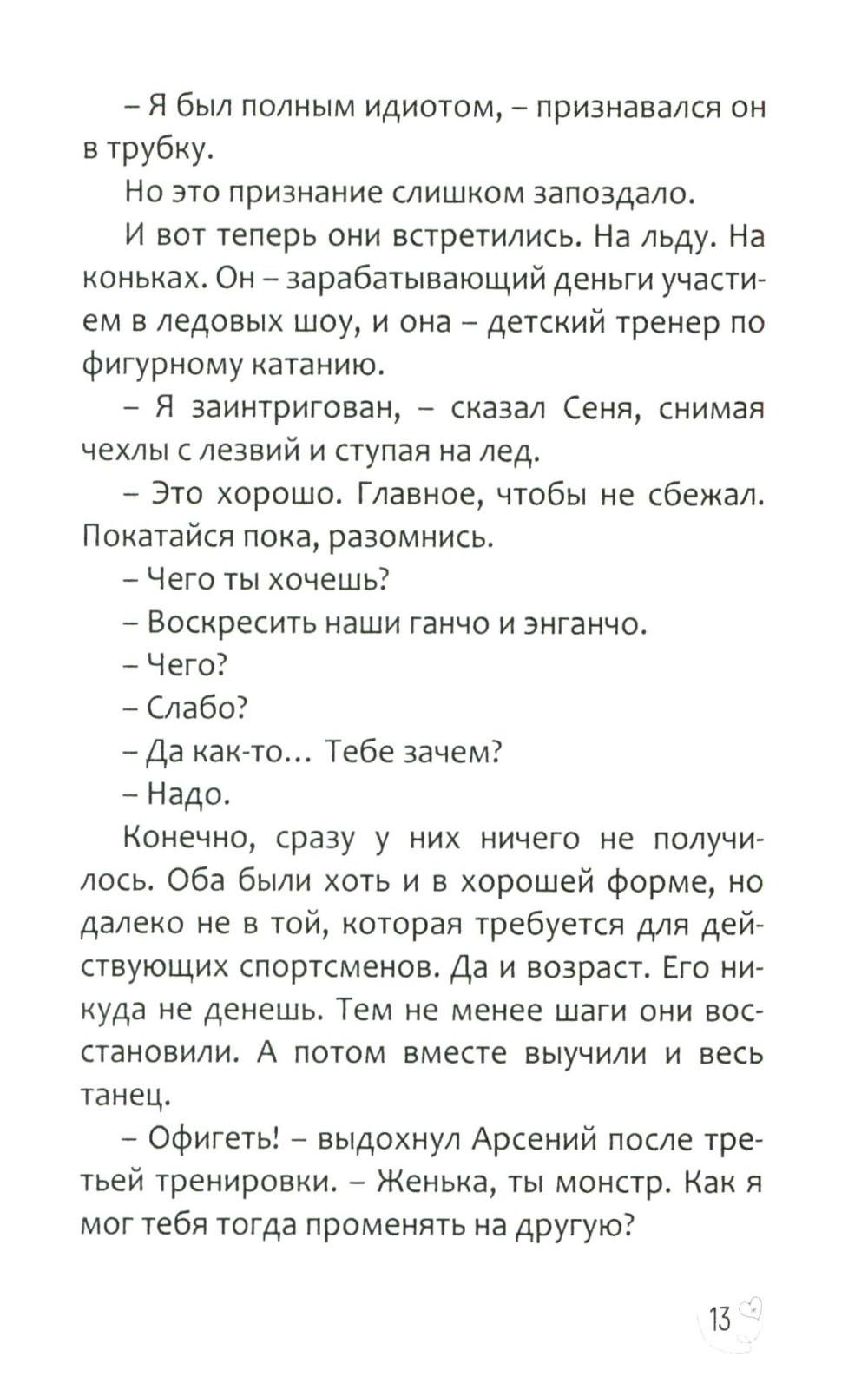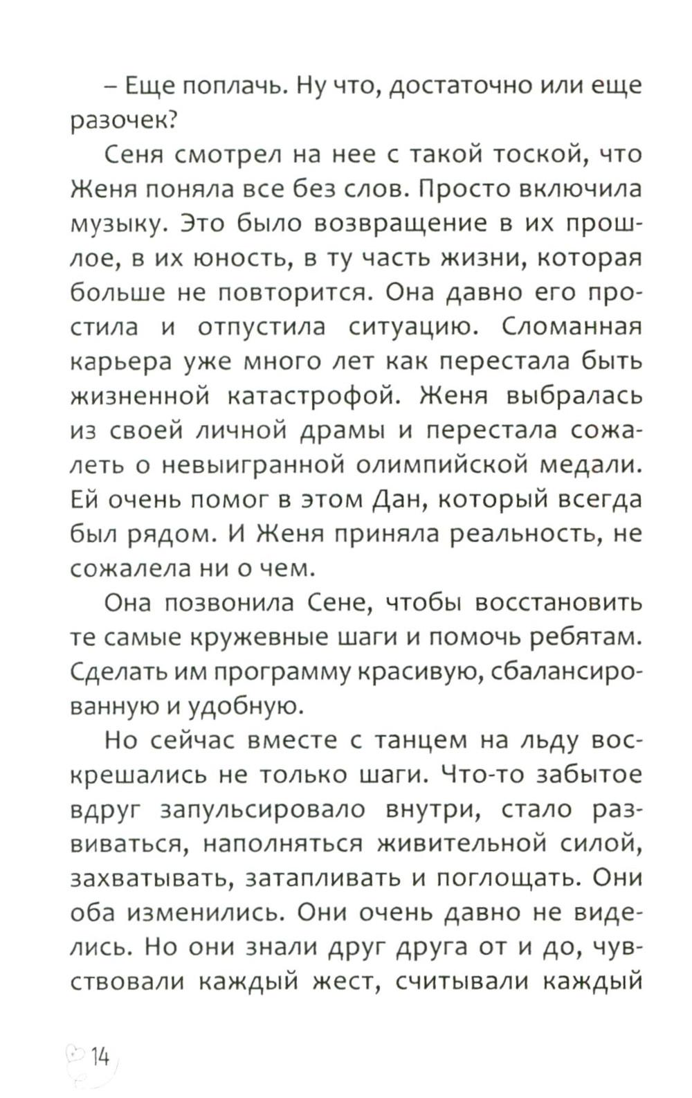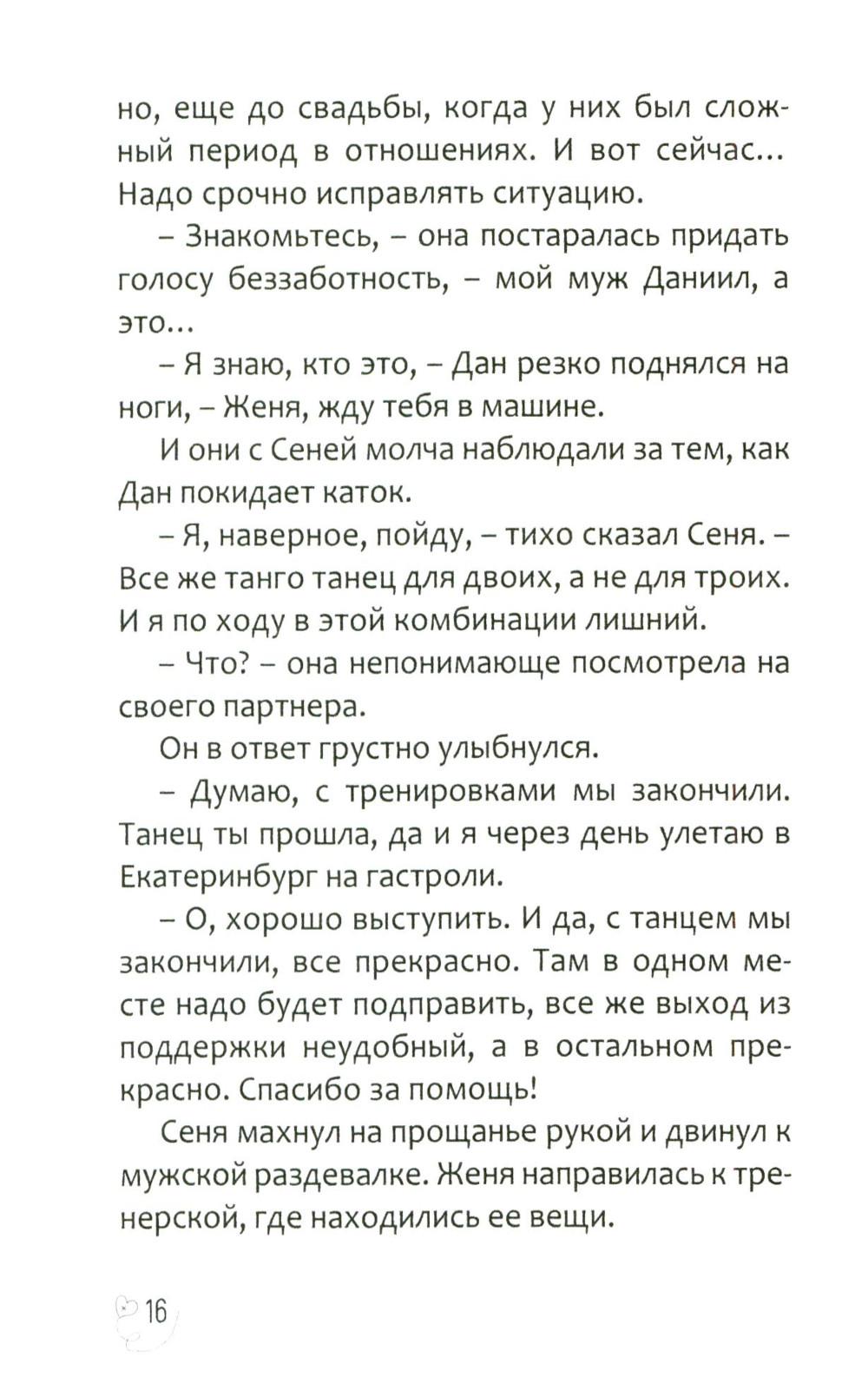 Когда-то из-за травмы оборвалась ее спортивная карьера. Не сразу, но жизнь наладилась. Прекрасная семья, любимое дело, вполне счастливое существование… И вдруг - поездка в Париж, а вместе с ней и возможность вернуться в прошлое, досказать то, что не успела тогда. Судьба дала второй шанс. Шанс, которым глупо было бы не воспользоваться. Эта история наполнена звуками танго, драйвом спортивного состязания, любовью и атмосферой зимнего Парижа. А в Париже, как известно, сбываются мечты.| Издательство | ИПО "У Никитских ворот" |