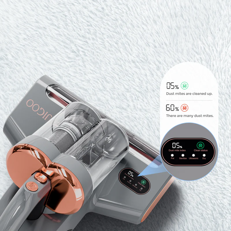 Ультрафиолетовая лампа JIGOO S300 Pro с длиной волны 253,7 нм уничтожает 99,99% клещей и бактерий в глубине матраса, а ультразвуковые волны останавливают размножение клещей, обеспечивая более тщательную и длительную уборку. А для вашей безопасности ультрафиолетовая лампа автоматически выключается, когда машина поднимается, чтобы не повредить глаза.