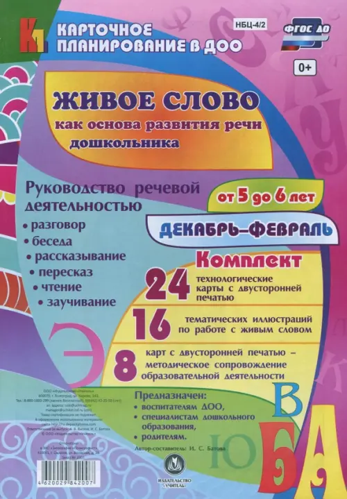 В комплекте, включающем 24 технологические карты и 16 тематических иллюстраций, а также методические рекомендации по организации образовательной работы по направлению "Речевое развитие" (разделы развитие связной речи и ознакомление с художественной литературой), раскрывается система работы по ознакомлению детей 5-6 лет с живым словом на декабрь-февраль учебного года. В представленном карточном планировании описана педагогическая деятельность по совершенствованию речи дошкольников, обогащению словарного запаса, формированию умения правильно строить речевые высказывания в соответствии с ФГОС ДО, освещена методика развития словесного творчества детей младшего дошкольного возраста, рассмотрены сочетающиеся виды деятельности художественно-речевой направленности - разговор, беседа, рассказывание и пересказ, поручения и задания, чтение художественной литературы, заучивание стихотворений.