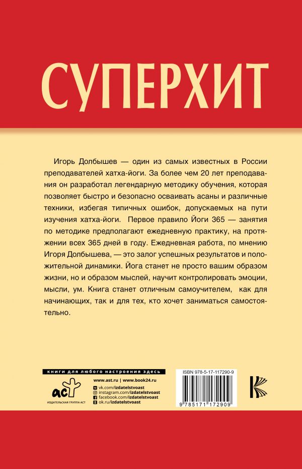 Игорь Долбышев - один из самых известных в России преподавателей хатха-йоги. За более чем 20 лет преподавания он разработал легендарную методику обучения, которая позволяет быстро и безопасно осваивать асаны и различные техники, избегая типичных ошибок, допускаемых на пути изучения хатха-йоги. Первое правило Йоги 365 - занятия по методике предполагают ежедневную практику, на протяжении всех 365 дней в году. Ежедневная работа, по мнению Игоря Долбышева, - это залог успешных результатов и положительной динамики. Йога станет не просто вашим образом жизни, но и образом мыслей, научит контролировать эмоции, мысли, ум. Книга станет отличным самоучителем, как для начинающих, так и для тех, кто хочет заниматься самостоятельно.