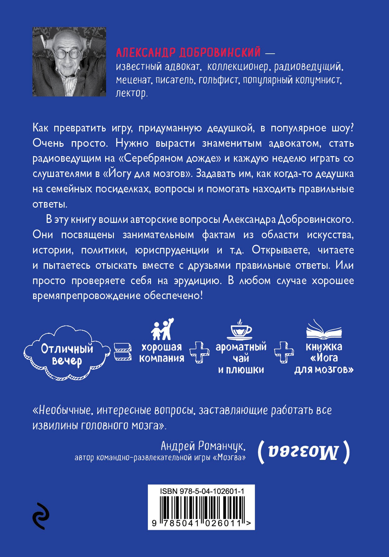 ОТ ИЗДАТЕЛЯ: Эта книга одновременно и увлекательная игра, и самый быстрый способ повысить свою эрудицию. В ней знаменитый адвокат и радиоведущий «Серебряного дождя» приводит увлекательные вопросы из области истории, юриспруденции, военного дела, культурологии и других тем, в которых должен разбираться любой образованный человек. «Почему рыцари-тамплиеры ложились спать одетыми?» «Откуда пошла традиция рукопожатия?» «Какой год в истории России был самым коротким?» Вы и сами не заметите, как начнете разбираться в массе вещей, о которых раньше даже не имели понятия. Первая половина книги посвящена вопросам, вторая - ответам на них. Можно играть семьей или с друзьями, пытаясь отыскать правильные ответы с помощью логики и общих знаний. А можно читать в свое удовольствие и запоминать факты, которые украсят любую беседу. ОТ АВТОРА: Вот как сам автор, адвокат Александр Добровинский, рассказывает о семейной игре, которая легла в основу этой книги: «Правила были чарующе просты. Ведущий, а, как правило, это и был дед, задавал вопрос: из истории, культуры, религии или народных обычаев. Все присутствующие могли задавать наводящие вопросы и получить на них короткие, но точные ответы. Иногда ведущий говорил, что вопрос легкий, и давал всем на ответ только пять или десять минут. По истечении этого времени нужно было озвучить свой вариант. Однако окончательная версия таила в себе некую опасность, потому что за правильный ответ игрок получал фишку (у нас на даче фишками были шашки и шахматы), а вот за неправильный ответ фишку отбирали в общую казну. Но сначала каждому участнику раздавали по три фишки, чтобы было что отобрать! Много-много лет спустя я вспомнил любимое семейное развлечение, когда надо было растить детей. Малявки страшно веселились и обожали наши еженедельные развлекательные посиделки. Гостям это нравилось тоже. Я начал готовиться серьезно и основательно. Читал исторические журналы, смотрел энциклопедии и так далее. Дети росли, гостей становилось все больше, да и вопросы пришлось постепенно усложнять. Я даже придумал название для этой игры - «Йога для мозгов». А потом случилось то, что случилось, и «Йогу для мозгов» пригласили на знаменитое радио «Серебряный дождь» на 100.1 FM. Семейное занятие стало единственной интеллектуально-развлекательной игрой в эфире нашей огромной страны. За пять лет «Йога для мозгов» превратилась в культовую программу для тысяч людей. Нас слушают по всей России. Мало того, нас слушают по всему миру. Я точно знаю, что, если вы серьезно отнесетесь к этому несерьезному развлечению, получите огромное удовольствие от этой маленькой игры! «Йога для мозгов» сделает ваши вечера красочнее, интереснее, она расширит ваш кругозор и отшлифует логику. Наслаждайтесь этой замечательной игрой и пишите мне о своих успехах!» Заслуженный мозгойог РФ Александр Добровинский| Издательство | ООО "Издательство "Эксмо" |