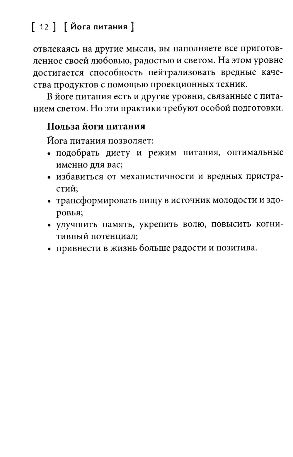 Йога питания - уникальный и глубокий подход, включающий в себя практики осознанного и интуитивного питания, управление здоровьем, техники медитации и визуализации. Человек - многомерное существо, и пищей для его тела, ума и души являются природные продукты, впечатления, эмоции, отношения, информация, образы, красота и т. д. Йога питания - искусство и технология, направленная на применение всех этих проявлений и энергий Вселенной для обретения здоровья, счастья, процветания, когнитивного развития и духовной самореализации. В книге представлены различные практики, рекомендации и рецепты, основанные на принципах классической йоги, аюрведы, осознанного питания, учения о чакрах и пяти оболочках души.| Издательство | Институт Метафизики |