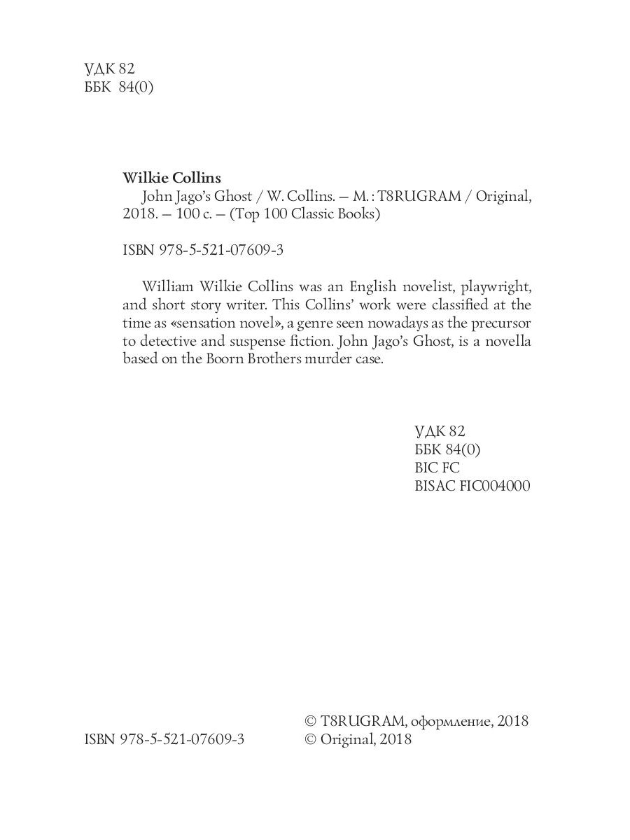 William Willcie Collins was an English novelist, playwright, and short story writer. This Collins' work were classified at the time as «sensation novel», a genre seen nowadays as the precursor to detective and suspense fiction. John Jago's Ghost, is a novella based on the Boorn Brothers murder case.| Издательство | Т8 RUGRAM |