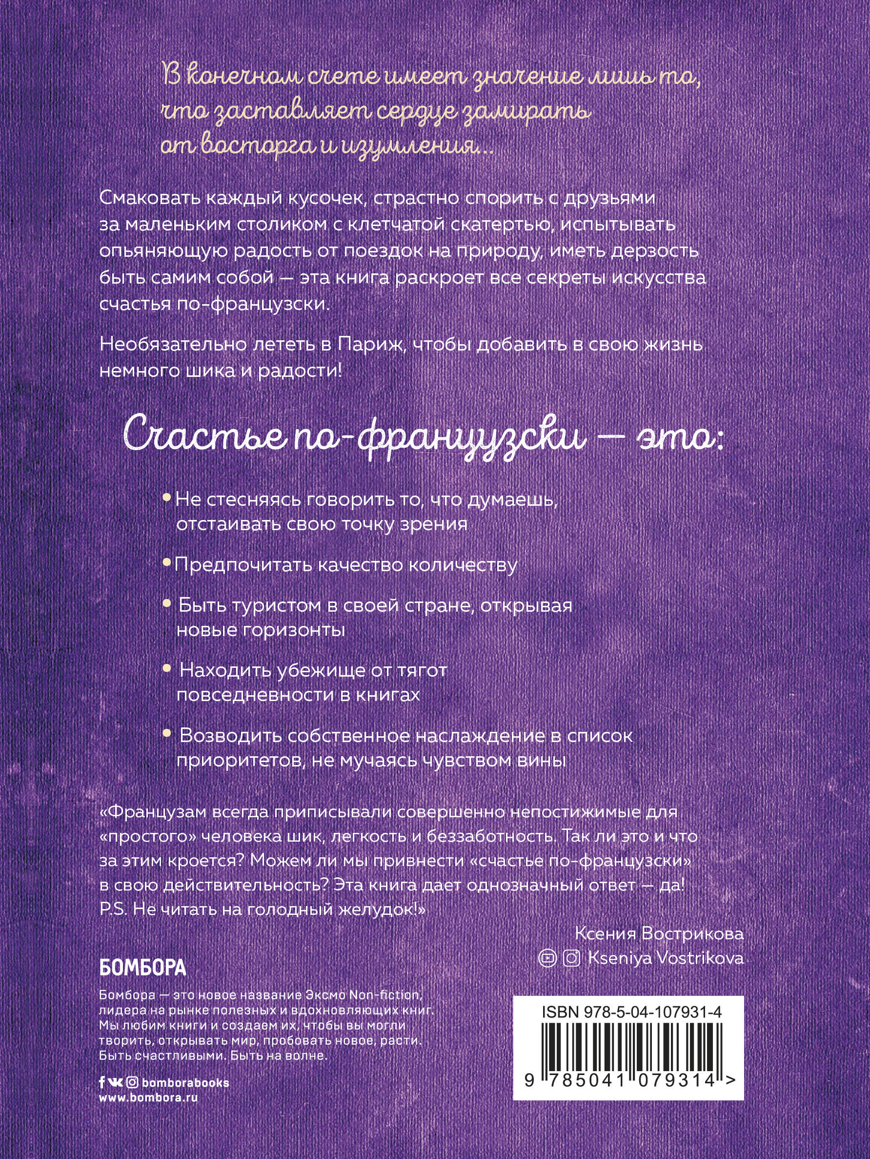 В конечном счете имеет значение лишь то, что заставляет сердце замирать от восторга и изумления… Смаковать каждый кусочек, страстно спорить с друзьями за маленьким столиком с клетчатой скатертью, испытывать опьяняющую радость от поездок на природу, иметь дерзость быть самим собой - эта книга раскроет все секреты искусства счастья по-французски. Необязательно лететь в Париж, чтобы добавить свою жизнь немного шика и радости! Счастье по-французски - это: - Не стесняясь говорить то, что думаешь, отстаивать свою точку зрения. - Предпочитать качество количеству. - Быть туристом в родной стране, открывая новые горизонты. - Находить убежище от тягот повседневности в книгах. - Возводить собственное наслаждение в список приоритетов, не мучаясь чувством вины. «Французам всегда приписывали совершенно непостижимые для «простого» человека шик, легкость и беззаботность. Так ли это и что за этим кроется? Можем ли мы привнести «счастье по-французски» в свою действительность? Эта книга дает однозначный ответ - да! P.S. Не читать на голодный желудок!» - Ксения Вострикова, блогер| Издательство | ООО "Издательство "Эксмо" |