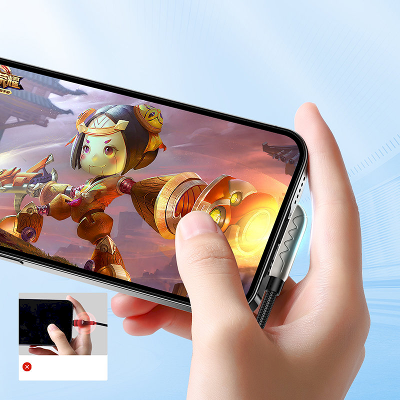 USB - Lightning cable with plugs bent at an angle of 90 degrees. The side Lightning plug reduces the risk of damaging the cable and increases the comfort of its use. The cable is perfect for gamers as it does not hinder playing your favorite games. Especially those that require the phone to be held horizontally. The cable is made of a high-quality zinc alloy encased in a strong nylon braid. The design of the cable and the materials from which it was made reduce tangling of the accessory. The current of 2.4A and the copper wire guarantee a quick and safe renewal of energy. An accessory designed for all devices with a Lightning port.