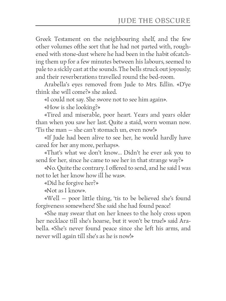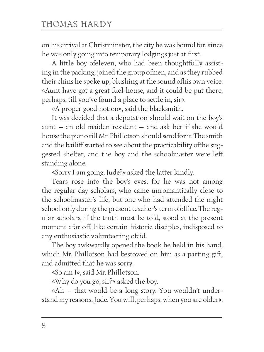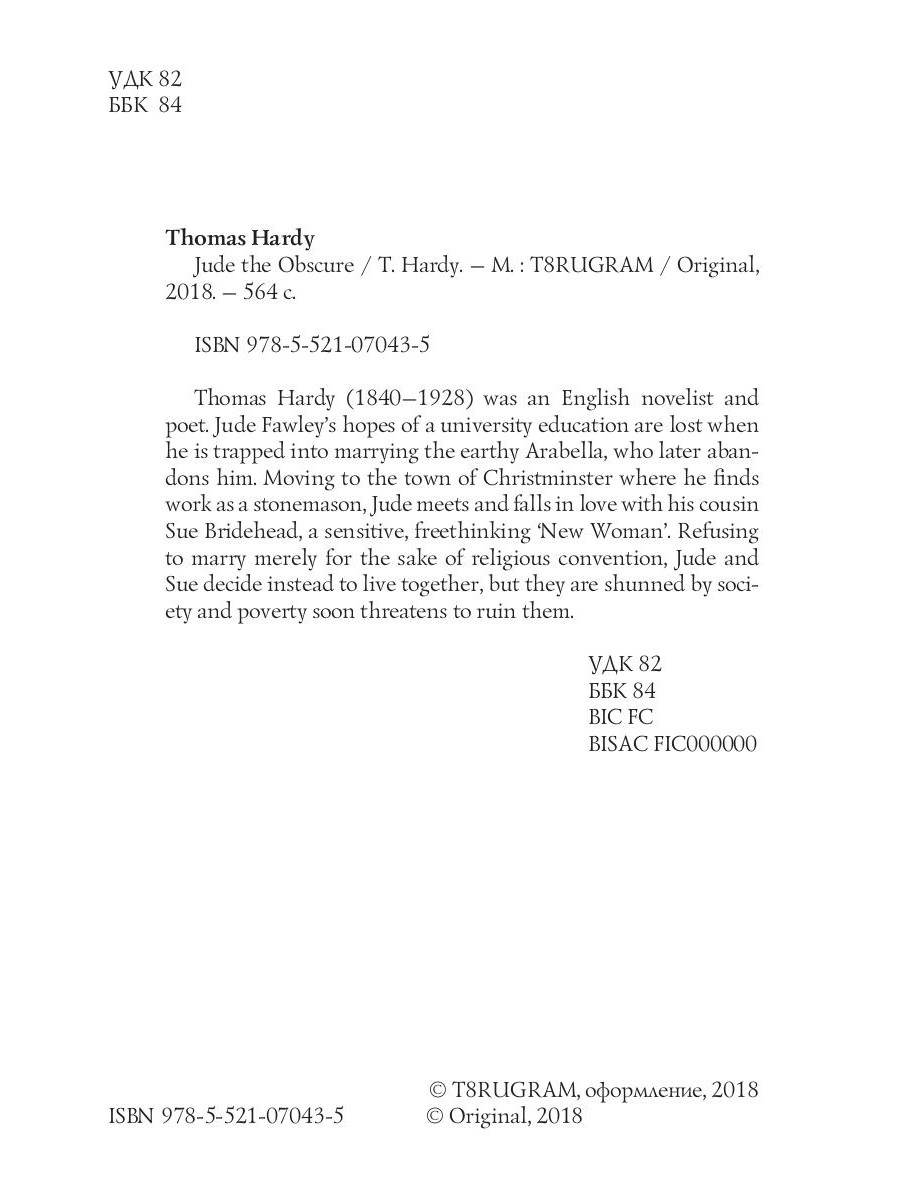 Thomas Hardy (1840-1928) was an English novelist and poet. Jude Fawley's hopes of a university education are lost when he is trapped into marrying the earthy Arabella, who later abandons him. Moving to the town of Christminster where he finds work as a stonemason, Jude meets and falls in love with his cousin Sue Bridehead, a sensitive, freethinking 'New Woman'. Refusing to marry merely for the sake of religious convention, Jude and Sue decide instead to live together, but they are shunned by society and poverty soon threatens to ruin them.| Издательство | Т8 RUGRAM |