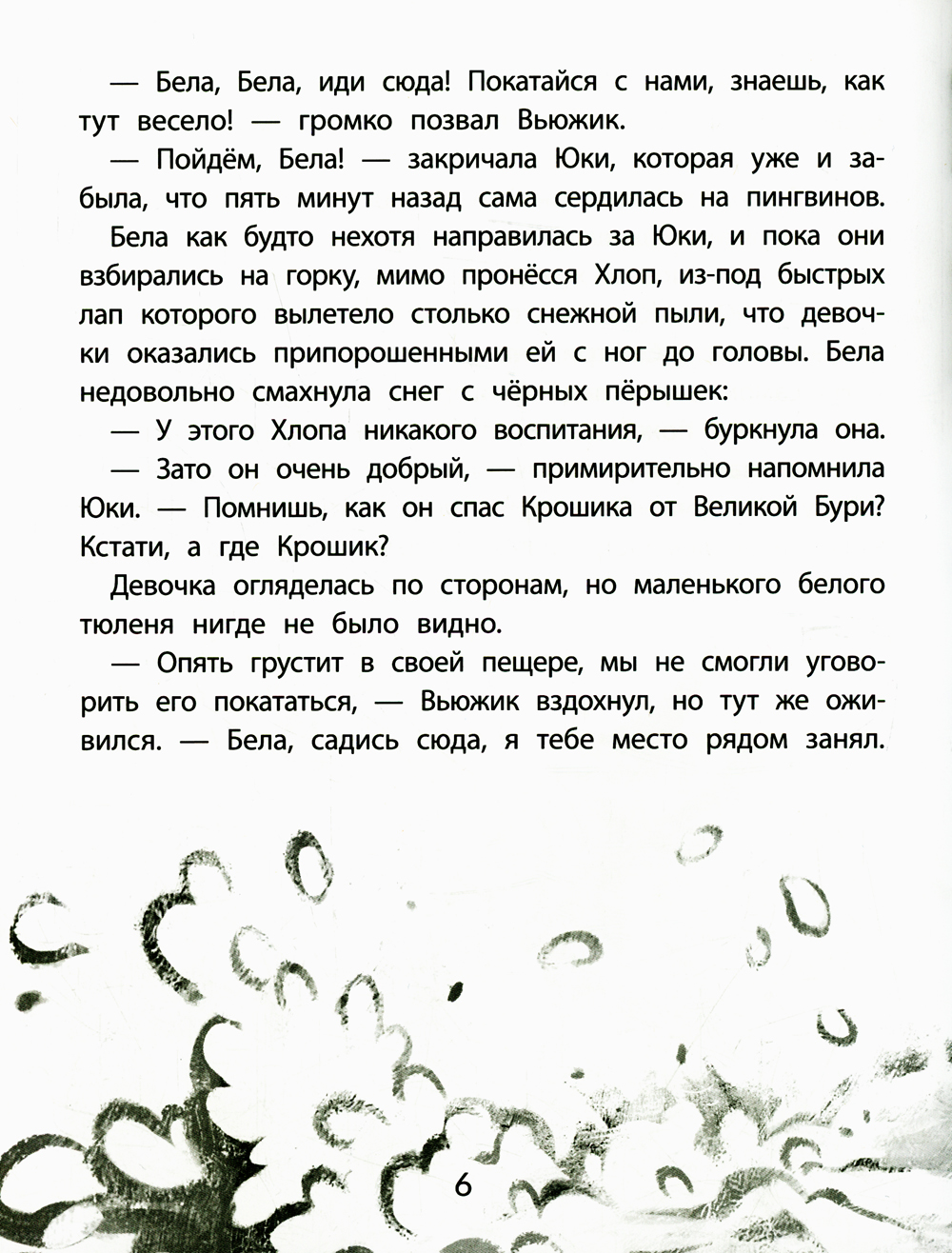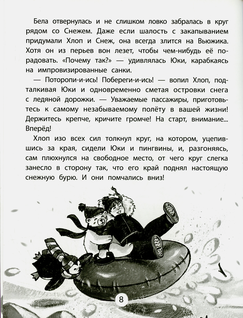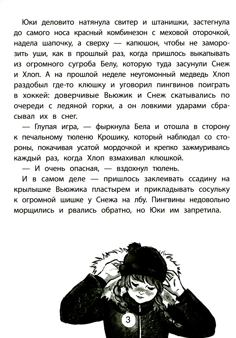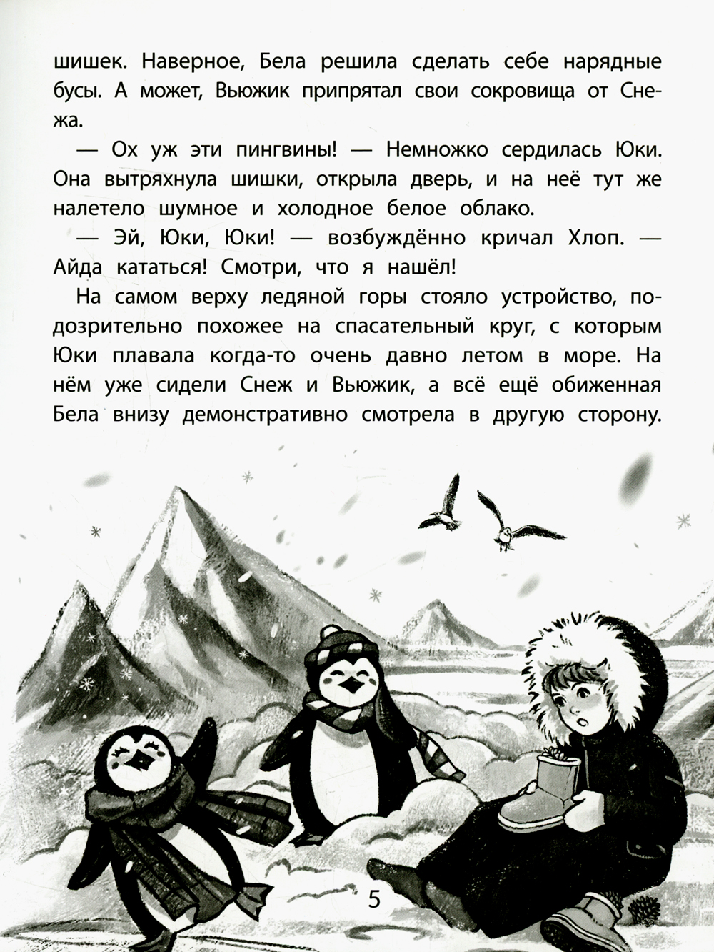 Маленькая Юля любит всё, что связано с Севером. Это трепетное отношение передалось ей от папы, который уехал в полярную экспедицию и почему-то долго не возвращается. Он дал дочке более «снежное» имя - Юки. Теперь девочка просит всех обращаться к ней только так. Юки очень скучает по папе и, чтобы вернуть его домой, решает отправиться на поиски северного сияния, исполняющего добрые желания. В этом ей помогают лучшие друзья - неразлучная троица пингвинов, медведь Хлоп и тюлень Крошик. Но на пути к мечте отважных путешественников поджидает Великая Буря и множество других опасностей, преодолеть которые можно только с помощью дружбы, любви и веры в чудо.| Издательство | Феникс |