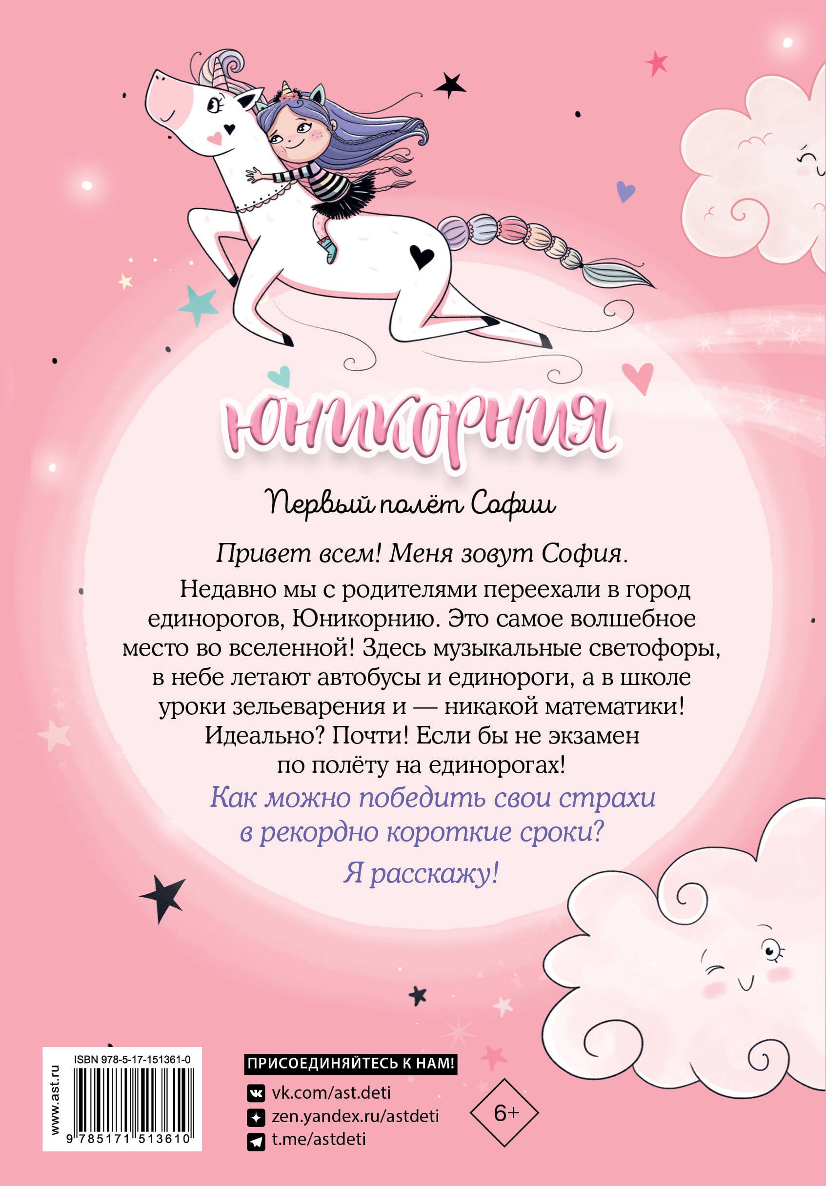 Привет всем! Меня зовут София. Недавно мы с родителями переехали в город единорогов, Юникорнию. Это самое волшебное место во вселенной! Здесь музыкальные светофоры, в небе летают автобусы и единороги, а в школе уроки зельеварения и - никакой математики! Идеально? Почти! Если бы не экзамен по полёту на единорогах! Как можно победить свои страхи в рекордно короткие сроки? Я расскажу!| Издательство | Издательство "АСТ" |