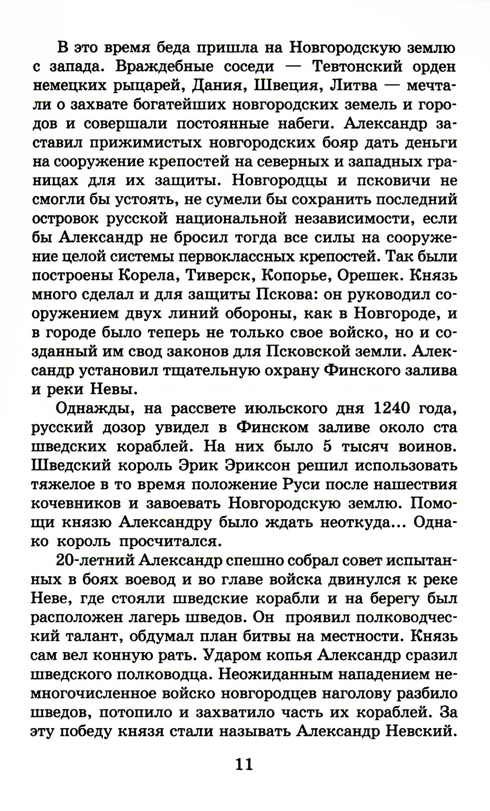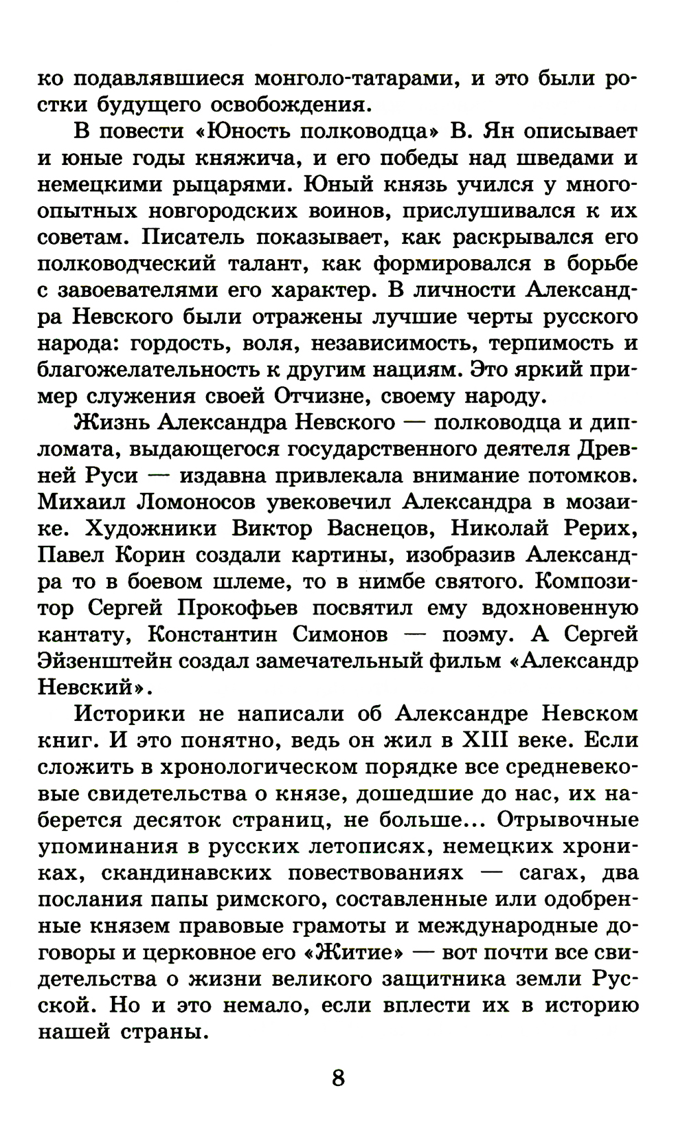 В исторической повести В. Яна рассказывается о детстве и юности князя Александра, об избрании его новгородским князем в тяжелое для Руси время монголо-татарского нашествия, когда проявился его полководческий талант. Последние главы посвящены победам Александра Невского - над шведами на реке Неве в 1240 году и над немецкими крестоносцами на Чудском озере, в Ледовом побоище в 1242 году. Для среднего школьного возраста.