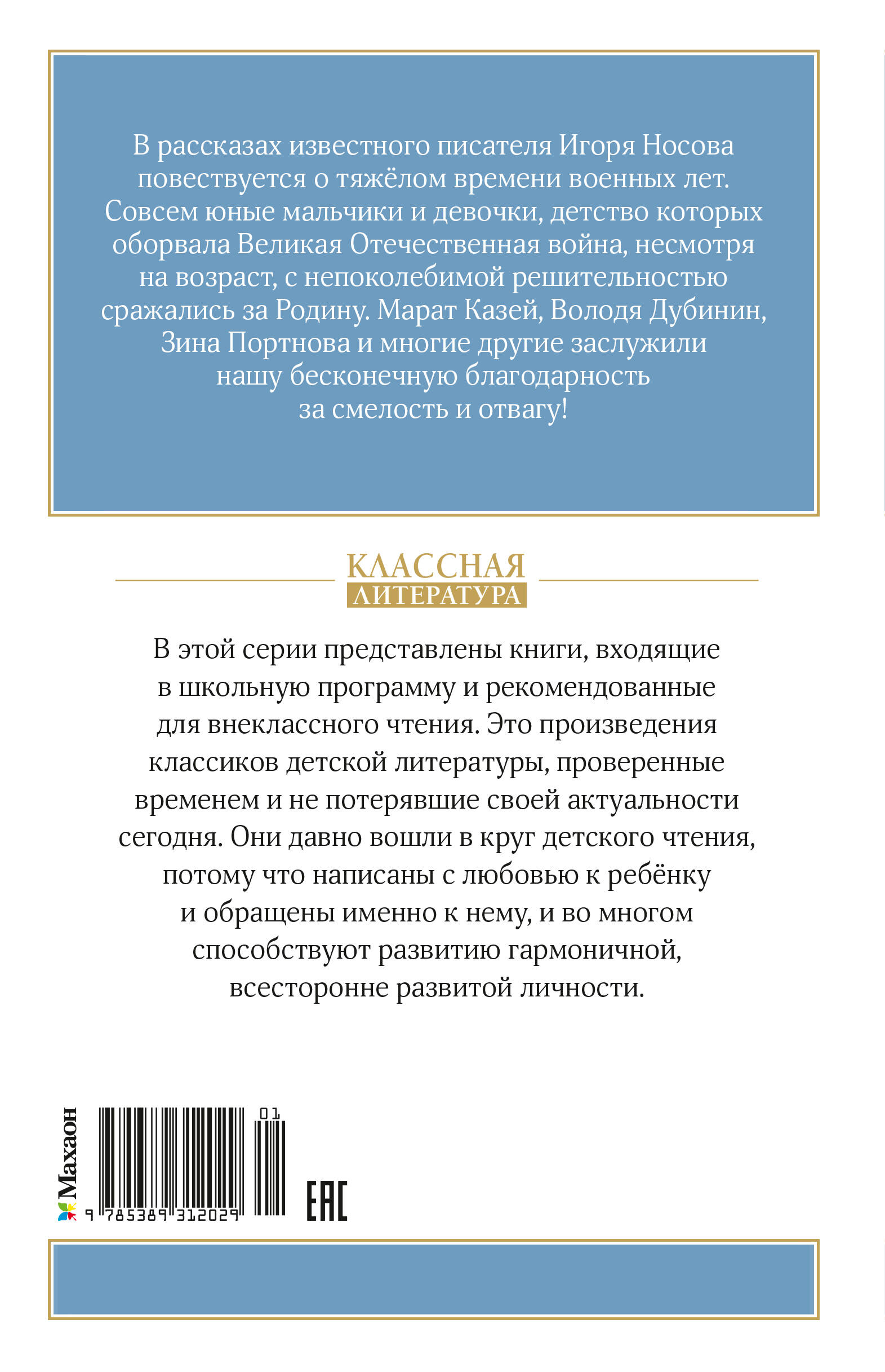В серии "Классная литература" представлены книги, входящие в школьную программу и рекомендованные для внеклассного чтения. Это произведения классиков детской литературы, проверенные временем и не потерявшие своей актуальности сегодня. Они давно вошли в круг детского чтения, потому что написаны с любовью к ребёнку и обращены именно к нему, и во многом способствуют развитию гармоничной, всесторонне развитой личности. В рассказах известного писателя Игоря Носова повествуется о тяжёлом времени военных лет. Совсем юные мальчики и девочки, детство которых оборвала Великая Отечественная война, несмотря на возраст, с непоколебимой решительностью сражались за Родину. Марат Казей, Володя Дубинин, Зина Портнова и многие другие заслужили нашу бесконечную благодарность за смелость и отвагу!
