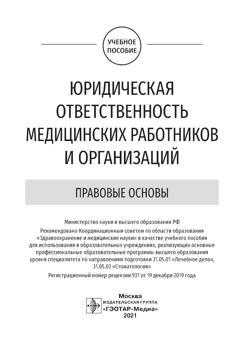 Аннотация: Юридическая ответственность медицинских работников и организаций. Правовые основы: Учебное пособие