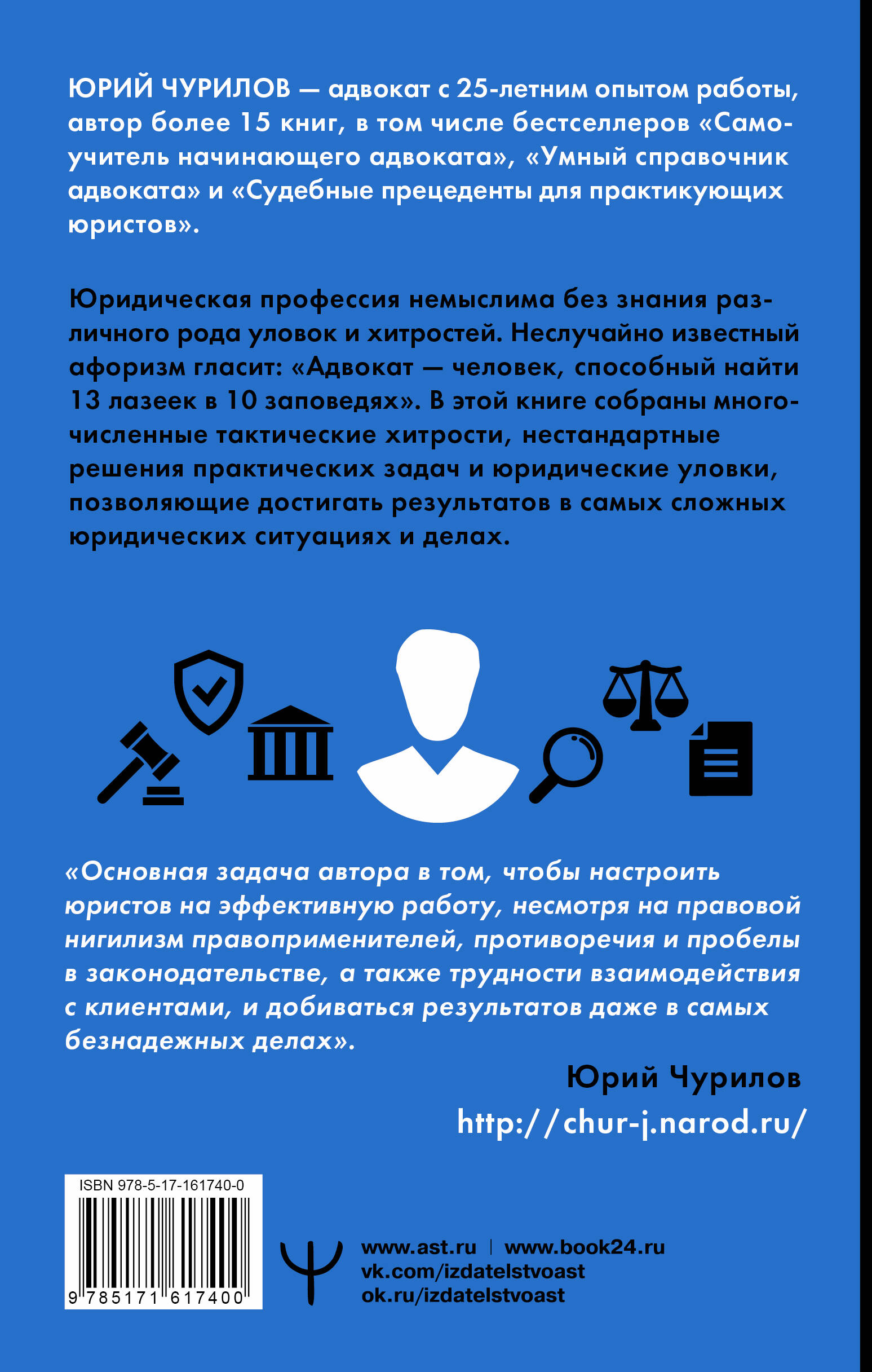 Новейшее издание бестселлера, полностью переработанное и дополненное в соответствии с актуальными изменениями законодательства! Юридическая профессия немыслима без знания различного рода уловок и хитростей. Неслучайно один из известных афоризмов гласит: «Адвокат - человек, способный найти 13 лазеек в 10 заповедях». Автор книги собрал воедино многочисленные тактические хитрости, нестандартные решения практических задач и юридические уловки, позволяющие достигать результатов даже в самых, на первый взгляд, безнадежных делах. Этому не учат в юридических вузах, поэтому книга будет интересна не только начинающим юристам и практикующим специалистам в различных отраслях права, но и широкому кругу читателей.| Издательство | Издательство "АСТ" |