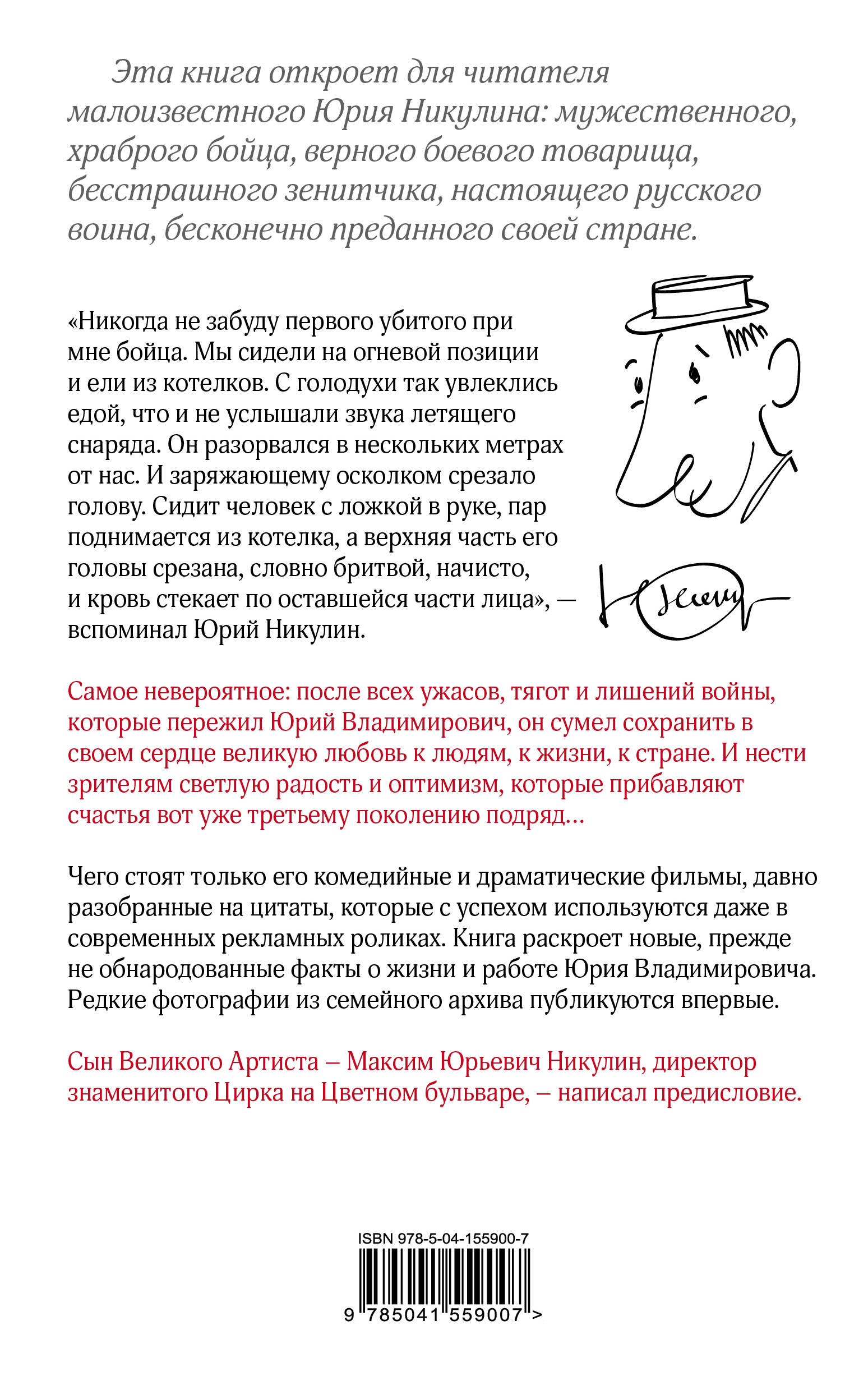 Эта книга откроет для читателя малоизвестного Юрия Никулина: мужественного, храброго бойца, верного боевого товарища, бесстрашного зенитчика, настоящего русского воина, бесконечно преданного своей стране. «Никогда не забуду первого убитого при мне бойца. Мы сидели на огневой позиции и ели из котелков. С голодухи так увлеклись едой, что и не услышали звука летящего снаряда. Он разорвался в нескольких метрах от нас. И заряжающему осколком срезало голову. Сидит человек с ложкой в руках, пар поднимается из котелка, а верхняя часть его головы срезана, словно бритвой начисто, и кровь стекает по оставшейся части лица», - вспоминал Юрий Никулин. Самое невероятное: после всех ужасов, тягот и лишений войны, которые пережил Юрий Владимирович, он сумел сохранить в своем сердце великую любовь к людям, к жизни, к стране. И нести зрителям светлую радость и оптимизм, которые прибавляют счастья вот уже третьему поколению подряд… Чего стоят только его комедийные и драматические фильмы, цитаты из которых давно «разобраны» и с успехом используются даже в современных рекламных роликах. Книга раскроет новые, прежде не обнародованные факты о жизни и работе Юрия Владимировича. Редкие фотографии из семейного архива публикуются впервые. Сын великого актера - Максим Юрьевич Никулин, директор знаменитого Цирка на Цветном бульваре - написал предисловие.| Издательство | ООО "Издательство "Эксмо" |