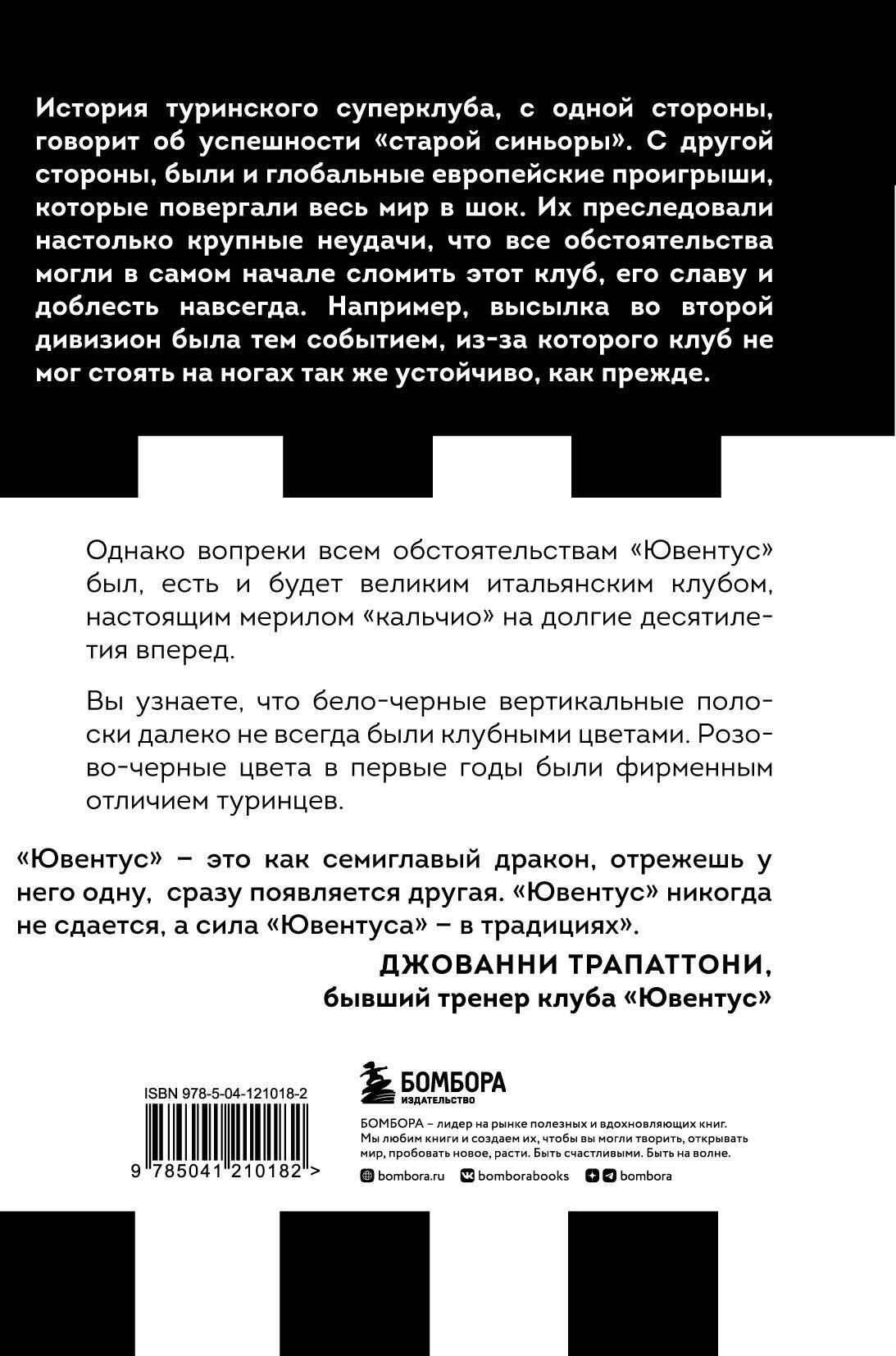 История туринского суперклуба, с одной стороны, говорит об успешности «старой синьоры». С другой стороны, были и глобальные европейские проигрыши, которые повергали весь мир в шок. Их преследовали настолько крупные неудачи, что все обстоятельства могли в самом начале сломить этот клуб, его славу и доблесть навсегда. Например, высылка во второй дивизион была тем событием, из-за которого клуб не мог стоять на ногах так же устойчиво, как прежде. Однако, вопреки всем обстоятельствам, «Ювентус» был, есть и будет великим итальянским клубом, настоящим мерилом «кальчио» на долгие десятилетия вперёд. Вы узнаете, что бело-чёрные вертикальные полоски далеко не всегда были клубными цветами. Розово-чёрные цвета в первые годы были фирменным отличием туринцев. "Ювентус" - это как семиглавый дракон, отрежешь у неё одну, но сразу появляется другая. "Ювентус" никогда не сдаётся, а сила "Ювентуса" - в традициях». - Джованни Трапаттони| Издательство | ООО "Издательство "Эксмо" |