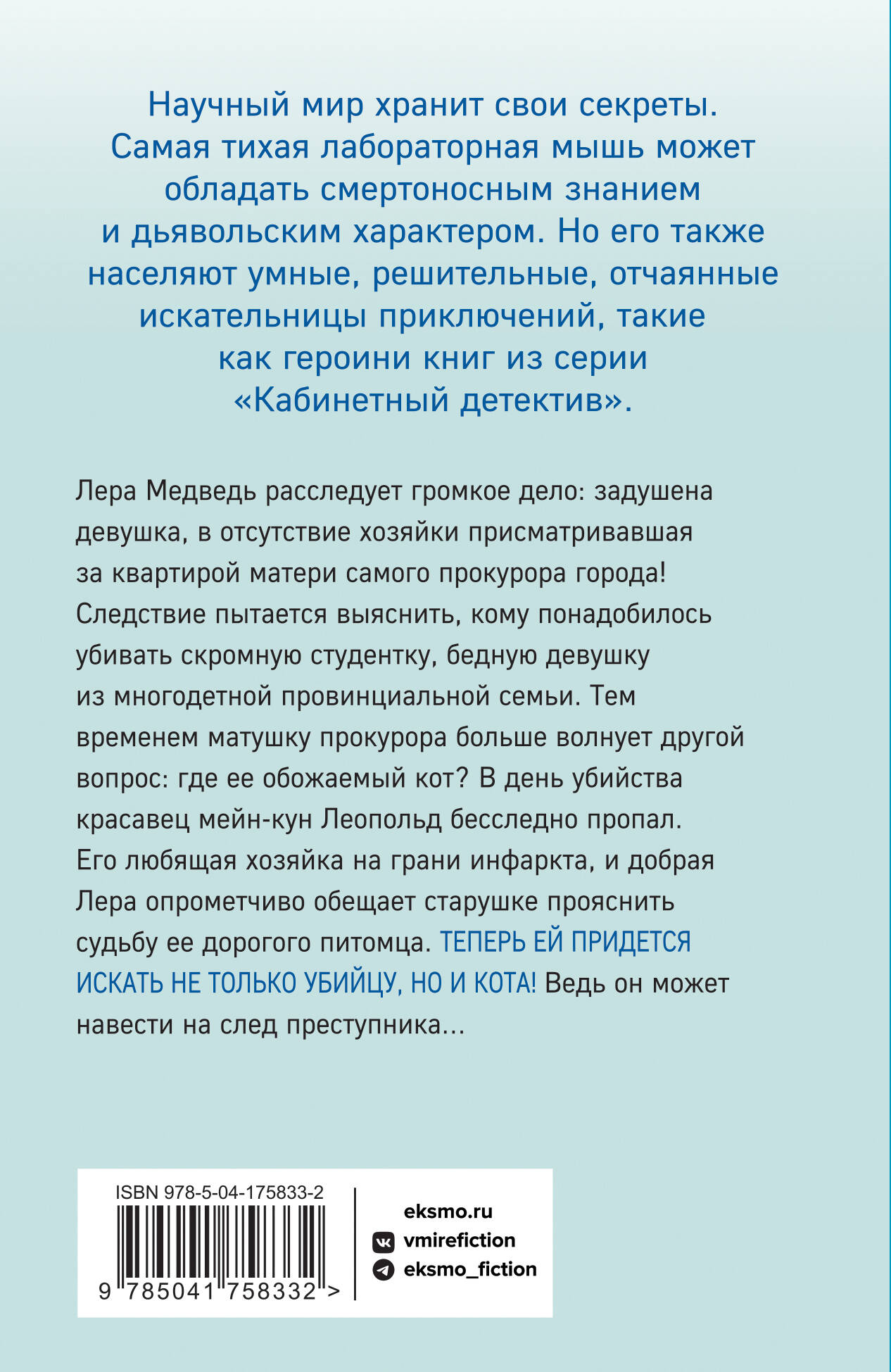 Лера Медведь расследует громкое дело: задушена девушка, в отсутствие хозяйки присматривавшая за квартирой матери самого прокурора города! Следствие пытается выяснить, кому понадобилось убивать скромную студентку, бедную девушку из многодетной провинциальной семьи. Тем временем матушку прокурора больше волнует другой вопрос: где ее обожаемый кот? В день убийства красавец-мейнкун Леопольд бесследно пропал. Его любящая хозяйка на грани инфаркта, и добрая Лера опрометчиво обещает старушке прояснить судьбу ее дорого питомца. Теперь ей придется искать не только убийцу, но и кота! Впрочем, Леопольд ведь может оказаться важным свидетелем - он был на месте преступления! Но какой помощи следствию можно ожидать от неразумного животного?.. Героини остросюжетных романов Ирины Градовой очаровательны, стремительны и непредсказуемы, как океанская волна. Этих бесстрашных и обаятельных женщин ждут невероятные приключения, а читателей - увлекательные романы, от которых просто невозможно оторваться.| Издательство | ООО "Издательство "Эксмо" |