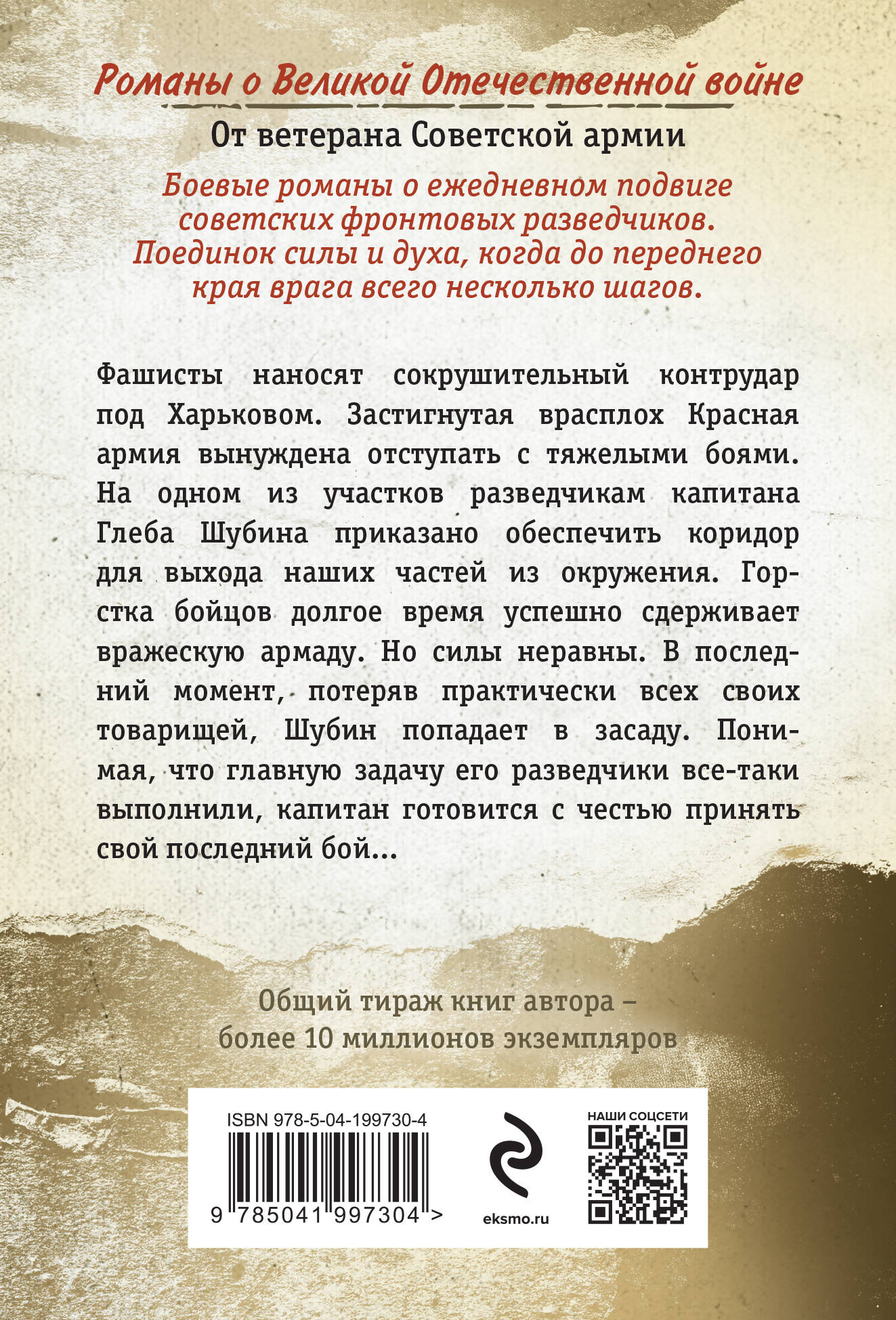 Боевые романы о ежедневном подвиге советских фронтовых разведчиков. Поединок силы и духа, когда до переднего края врага всего несколько шагов. Подробности жестоких боев, о которых не рассказывают даже ветераны - участники тех событий. Фашисты наносят сокрушительный контрудар под Харьковом. Застигнутая врасплох Красная Армия вынуждена отступать с тяжелыми боями. На одном из участков разведчикам капитана Глеба Шубина приказано обеспечить коридор для выхода наших частей из окружения. Горстка бойцов долгое время успешно сдерживает вражескую армаду. Но силы неравные. В последний момент, потеряв практически всех своих товарищей, Шубин попадает в засаду. Понимая, что главную задачу его разведчики все-таки выполнили, капитан готовится с честью принять свой последний бой… Общий тираж книг автора - более 10 миллионов экземпляров.| Издательство | ООО "Издательство "Эксмо" |