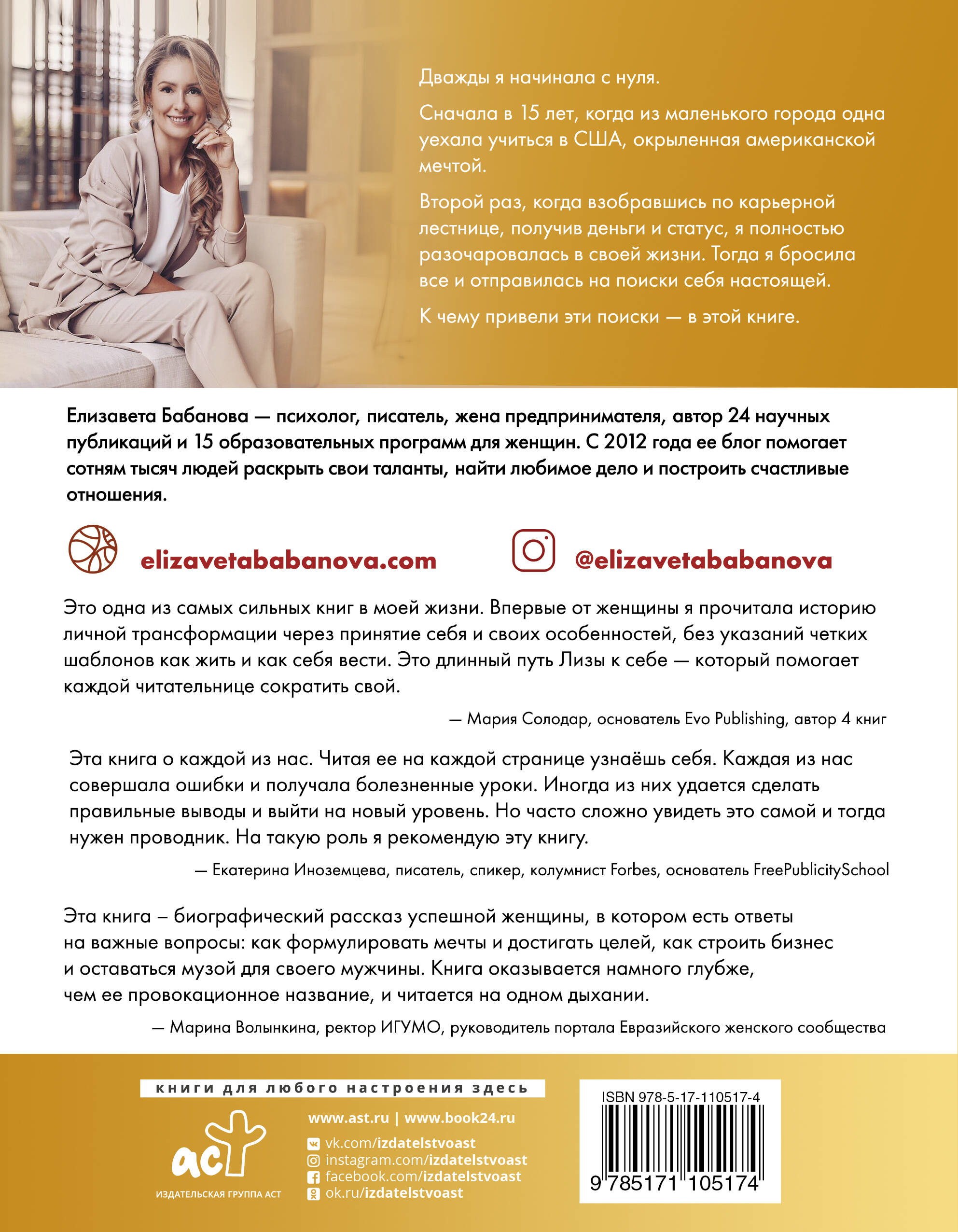Елизавета Бабанова - психолог, писатель, жена предпринимателя, автор 24 научных публикаций и 15 образовательных программ для женщин. С 2012 года ее блог помогает сотням тысяч людей раскрыть свои таланты, найти любимое дело и построить счастливые отношения. Если вы ищете себя, свое дело, своего мужчину - вливайтесь в сообщество современных женщин, где вы найдете поддержку в достижении ваших самых дерзких целей. Дважды я начинала с нуля. Сначала в 15 лет, когда из маленького города одна уехала учиться в США, окрыленная американской мечтой. Второй раз, когда взобравшись по карьерной лестнице, получив деньги и статус, я полностью разочаровалась в своей жизни. Тогда я бросила все и отправилась на поиски себя настоящей. К чему привели эти поиски - в этой книге.| Издательство | ИЗДАТЕЛЬСТВО "АСТ" |