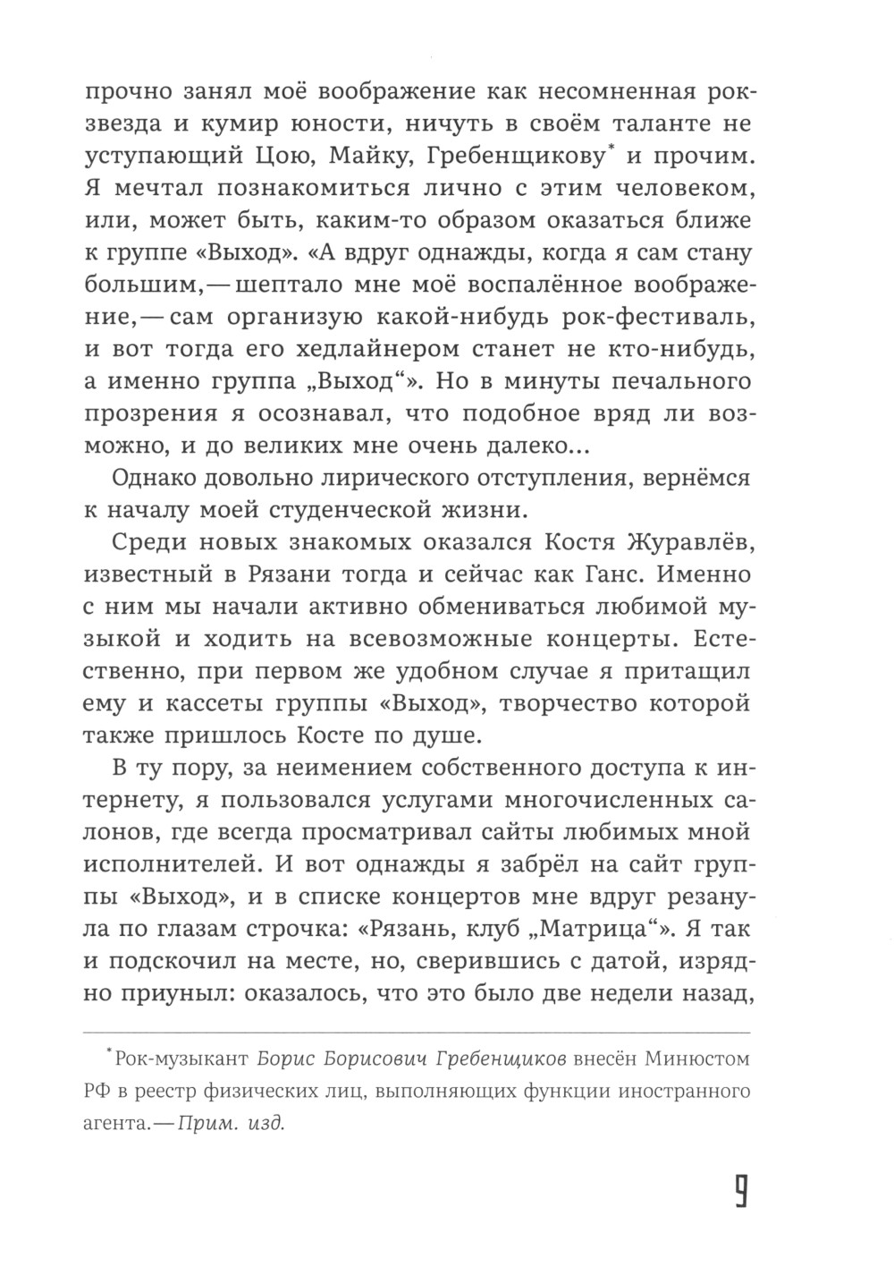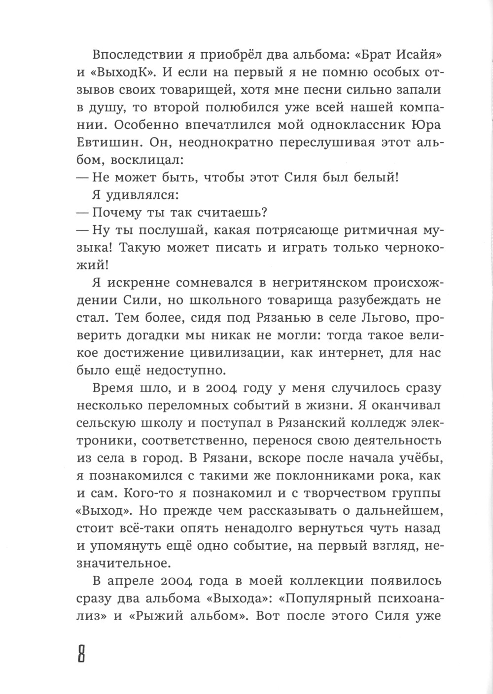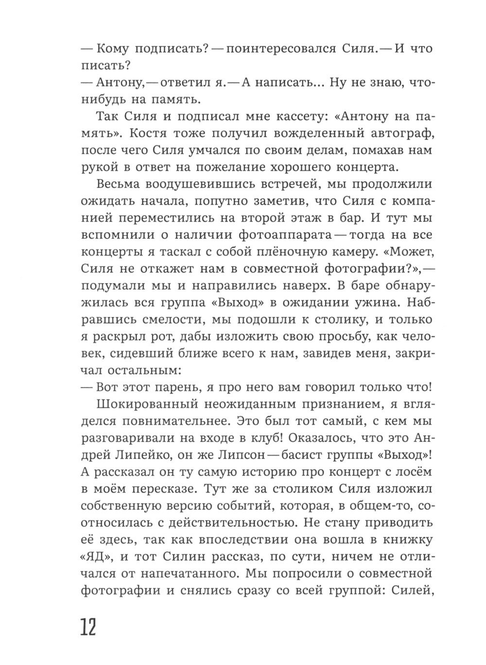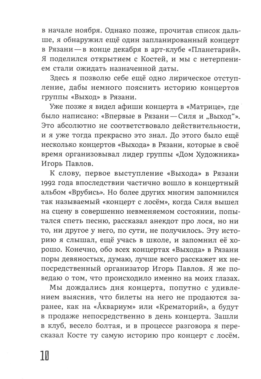 В настоящий сборник вошли рассказы о знакомстве, встречах и концертах легендарного российского рок-музыканта Сергея «Сили» Селюнина, лидера группы «Выход», погибшего в 2021 году. Благодаря продолжительному личному знакомству автор рассказывает преимущественно о рязанских выступлениях Сили и нескольких фестивалях, охватывая период с 2008 по 2021 год и предоставляя читателям возможность самостоятельно оценить личность и поступки музыканта.| Издательство | Выргород |