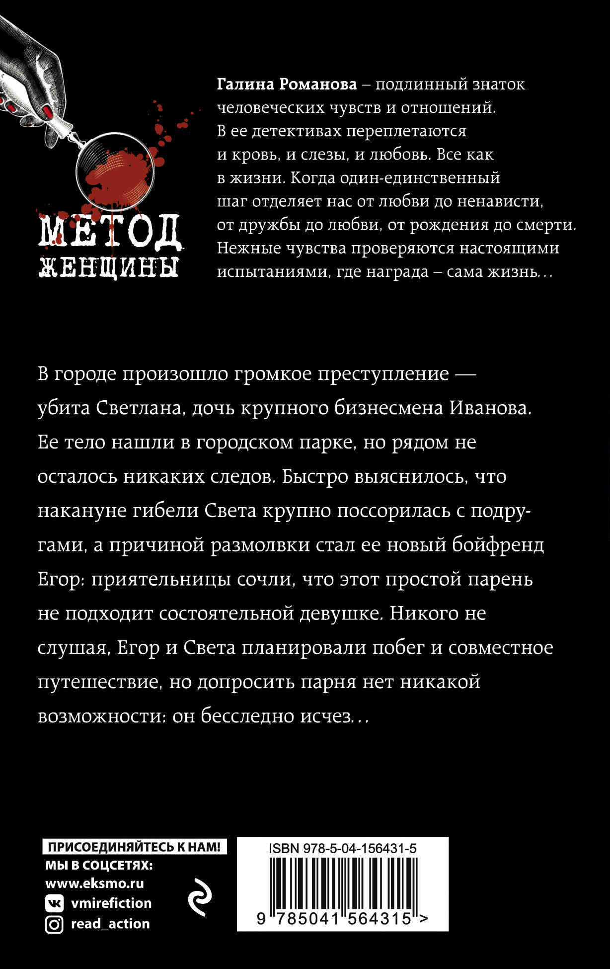 В городе произошло громкое преступление - убита Светлана, дочь крупного бизнесмена Иванова. Ее тело нашли в городском парке, но рядом не осталось никаких следов. Быстро выяснилось, что накануне гибели Света крупно поссорилась с подругами, и причиной размолвки стал ее новый бойфренд Егор: приятельницы сочли, что этот простой парень не подходит состоятельной девушке. Никого не слушая, Егор и Света планировали побег и совместное путешествие, но допросить парня нет никакой возможности: он бесследно исчез… Сложно было представить, что авантюрная идея изложить на бумаге придуманную криминальную историю внезапно перерастет во что-то серьезное и станет смыслом жизни. Именно с этого начался творческий путь российской писательницы Галины Романовой. И сейчас она по праву считается подлинным знатоком чувств и отношений. Суммарный тираж книг Галины Романовой превысил 3 миллиона экземпляров.| Издательство | ООО "Издательство "Эксмо" |