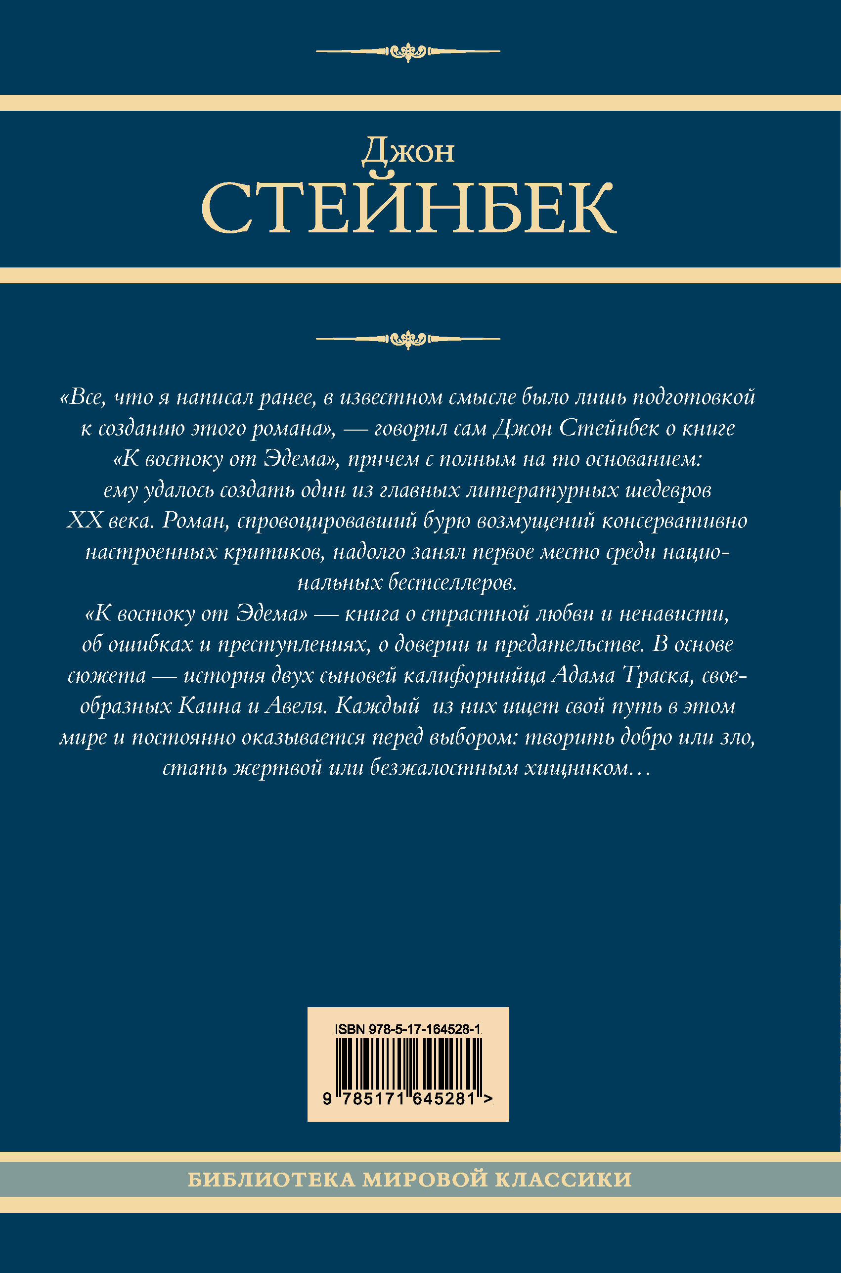 "Все, что я написал ранее, в известном смысле было лишь подготовкой к созданию этого романа", - говорил сам Джон Стейнбек о книге "К востоку от Эдема", причем с полным на то основанием: ему удалось создать один из главных литературных шедевров ХХ века. Роман, спровоцировавший бурю возмущений консервативно настроенных критиков, надолго занял первое место среди национальных бестселлеров. "К востоку от Эдема" - книга о страстной любви и ненависти, об ошибках и преступлениях, о доверии и предательстве. В основе сюжета - история двух сыновей калифорнийца Адама Траска, своеобразных Каина и Авеля. Каждый из них ищет свой путь в этом мире и постоянно оказывается перед выбором: творить добро или зло, стать жертвой или безжалостным хищником…| Издательство | Издательство "АСТ" |