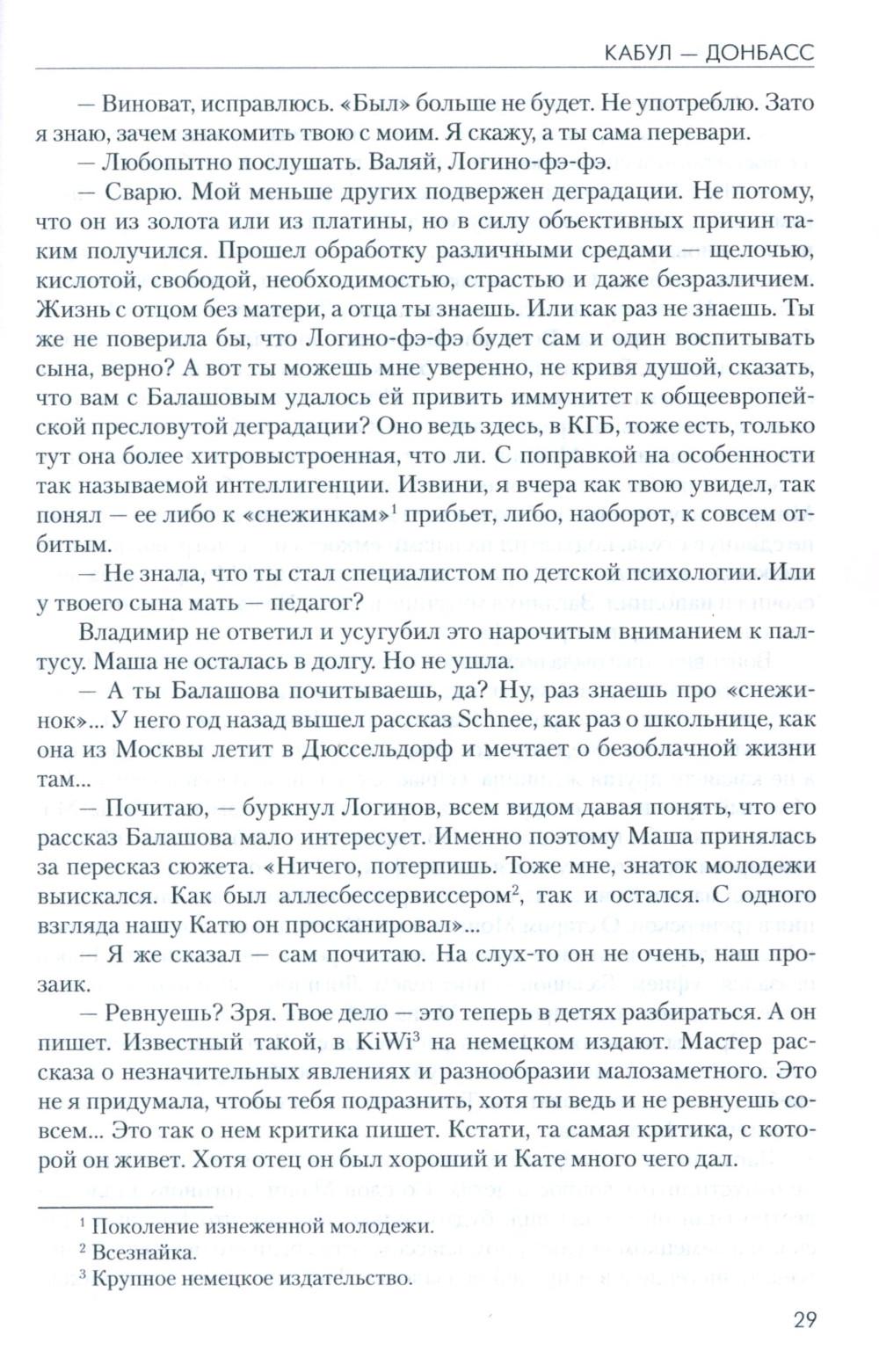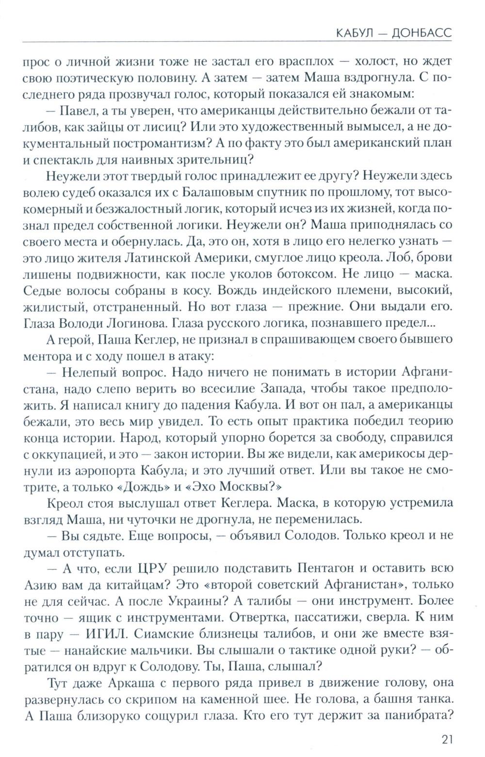Лето 2021 года. Армия США покидает Афганистан, талибы овладевают Кабулом. Из тюрьмы выходит вожак группы опытных диверсантов, которые двадцать лет назад через Северный Кавказ и Москву были заброшены в Германию для совершения теракта такого масштаба, который должен был потрясти мир («Кабул - Кавказ», «Кабул - Нью-Йорк»). Его освобождение не случайно - на него самые серьезные виды имеют разведчики нескольких стран, нацелившиеся воевать с Россией различными методами вплоть до ее полного изничтожения. Так оживает история, которая, казалось бы, закончилась арестом всей группы в середине 2000-х. Тогда аресту в Германии поспособствовали отставной полковник спецназа КГБ СССР Миронов и его более молодые знакомые - московский писатель Балашов, журналистка Войтович, востоковед Логинов. Но Миронова больше нет, он погиб. Логинова судьба мотает по свету, Балашов осел в Германии, Маша Войтович с дочерью, Катей Балашовой, возвращается из Кельна в Москву. В отношениях между Россией и Европой пролегла пропасть. И кто знает, если бы не обстоятельство чрезвычайной силы, им всем не дано было бы встретиться. Это обстоятельство - начало СВО. Балашов по определенным причинам оказывается нужен немецкому разведчику, долгие годы работавшему в Афганистане. Двадцать лет спустя герои книг «Кабул - Кавказ» и «Кабул - Нью-Йорк» снова оказываются в колее большой мировой истории и вступают в схватку, цена которой - больше чем их собственные жизни. «Кабул - Донбасс», «Кабул - Нью-Йорк» и «Кабул - Кавказ» - это три книги большого романа «Век смертника». «Кабул - Нью-Йорк» был дописан в 2006 году, когда интервенция США и их союзников в Афганистане была в самом разгаре, а «Кабул - Кавказ» был закончен летом 2001 года, за несколько недель до теракта 11 сентября. «Кабул - Донбасс», как и две предыдущие части трилогии, - не детектив. Это философский роман о современности в форме триллера и расследования.| Издательство | Вече |