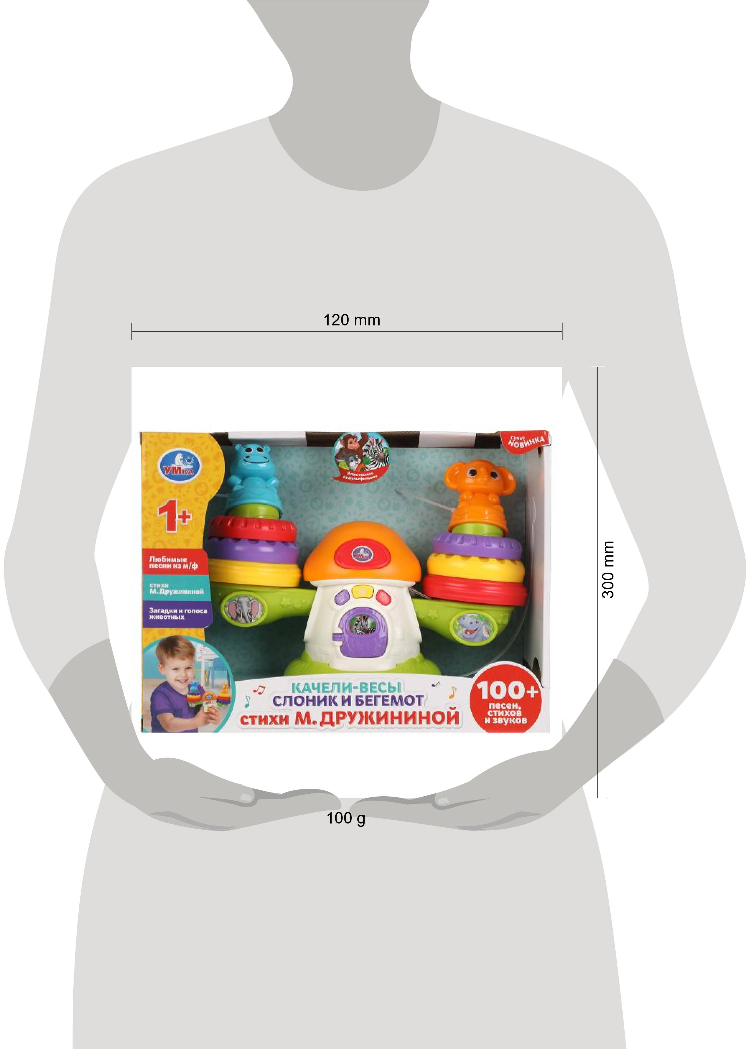 Интерактивная игрушка "Качели-весы. Слоник и бегемот" ТМ "УМка" станет прекрасным подарком для ребёнка: - 4 песни из м/ф: "Песня Мамонтёнка", "Чунга-Чанга", "Облака", "Улыбка" - 5 стихотворений М. Дружининой: "Слон", "Жираф", "Лев", "Носорог", "Обезьяна" - разнообразные звуки Играя с красочной игрушкой в виде качелей-весов, малыш услышит любимые песенки, добрые стихи Марины Дружининой и забавные звуки. Интерактивная игрушка ТМ "УМка" расширяет кругозор и развивает: - слуховое восприятие и музыкальный слух - визуальное восприятие - память - тактильные навыки - координацию движений - моторику - воображение Размер: 15 x 29 x 15 см. Материал: пластмасса. Работает от 2-х батареек типа АА. Рекомендовано детям от 1 года.| Издательство | С-Маркет ООО |