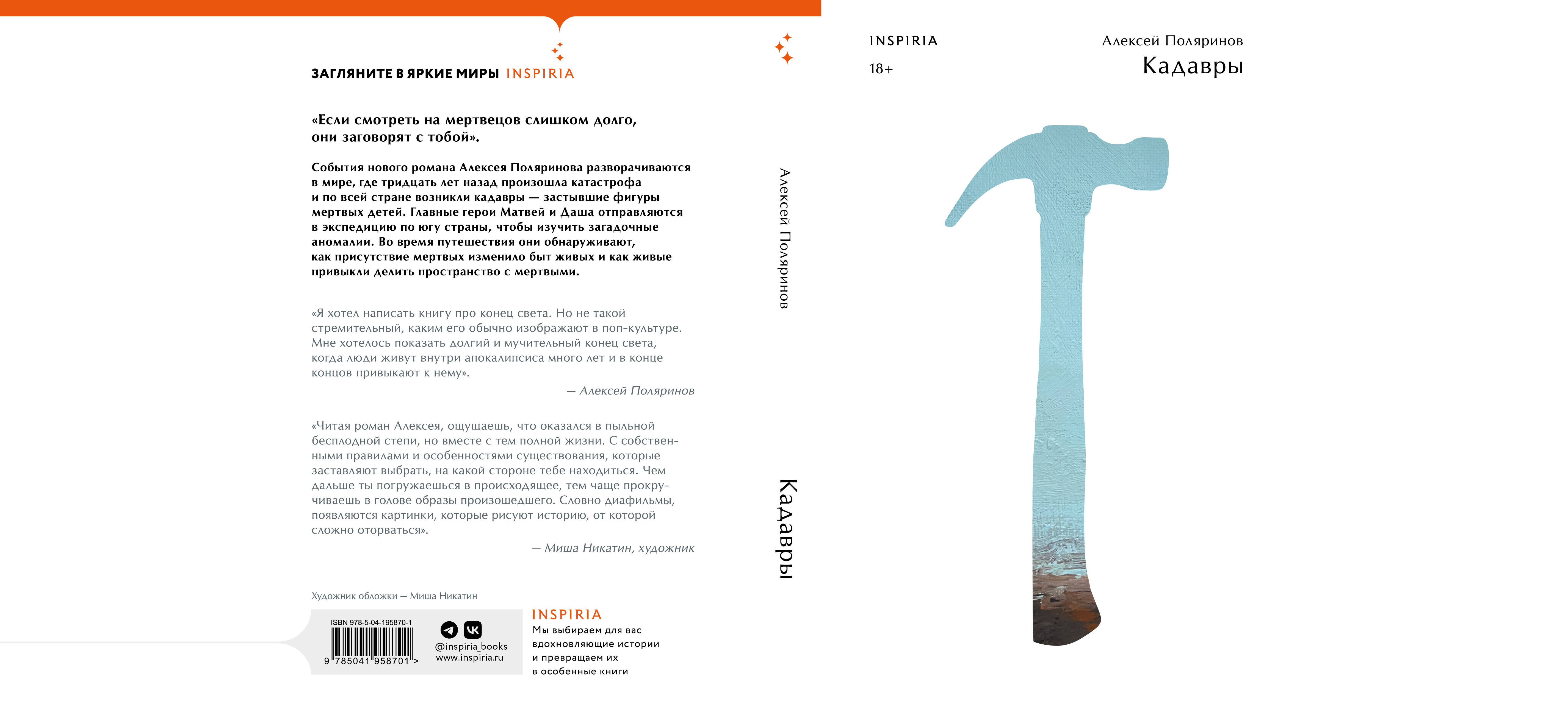 «Если смотреть на мертвецов слишком долго, они заговорят с тобой». События нового романа Алексея Поляринова разворачиваются в мире, где тридцать лет назад произошла катастрофа и по всей стране возникли кадавры - застывшие фигуры мертвых детей. Главные герои Матвей и Даша отправляются в экспедицию по югу страны, чтобы изучить загадочные аномалии. Во время путешествия они обнаруживают, как присутствие мертвых изменило быт живых и как живые привыкли делить пространство с мертвыми. «Я хотел написать книгу про конец света. Но не такой стремительный, каким его обычно изображают в поп-культуре. Мне хотелось показать долгий и мучительный конец света, когда люди живут внутри апокалипсиса много лет и в конце концов привыкают к нему». - Алексей Поляринов «Читая роман Алексея, ощущаешь, что оказался в пыльной бесплодной степи, но вместе с тем полной жизни. С собственными правилами и особенностями существования, которые заставляют выбрать - на какой стороне тебе находиться. Чем дальше ты погружаешься в происходящее, тем чаще прокручиваешь в голове образы произошедшего. Словно диафильмы, появляются картинки, которые рисуют историю, от которой сложно оторваться». - Миша Никатин, художник| Издательство | ООО "Издательство "Эксмо" |