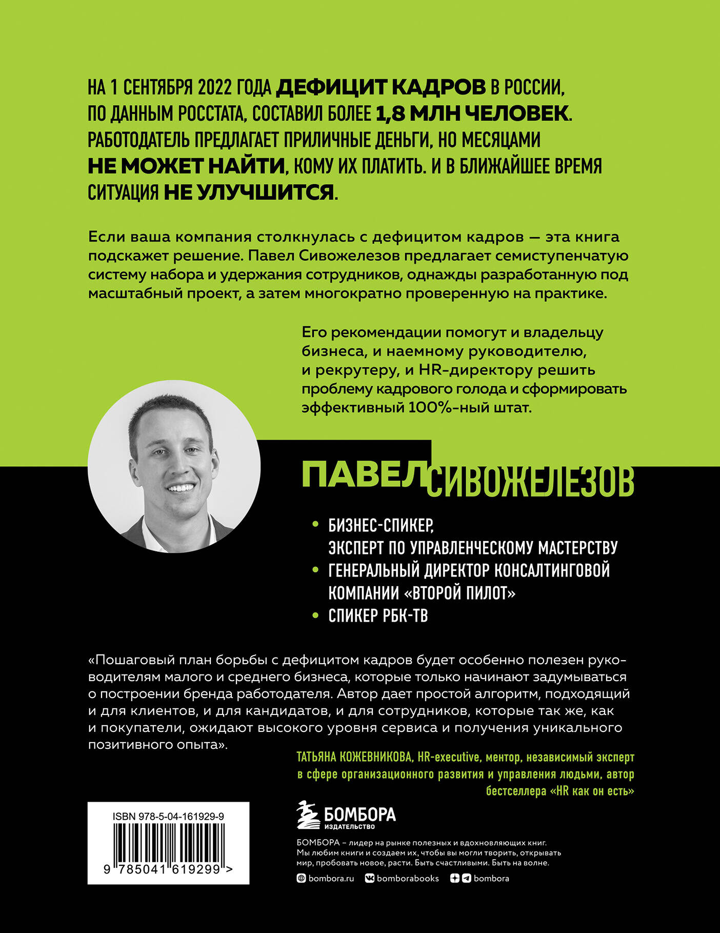 На 1 сентября 2022 года дефицит кадров в России, по данным Росстата, составил более 1,8 млн человек. Работодатель предлагает приличные деньги, но месяцами не может найти, кому их платить. И в ближайшее время ситуация не улучшится. Если ваша компания столкнулась с дефицитом кадров, - эта книга подскажет решение. Павел Сивожелезов - бизнес-спикер, эксперт по менеджменту с 17-летним стажем и предприниматель - предлагает однажды разработанную под масштабный проект, а затем многократно проверенную на практике семиступенчатую систему набора и удержания сотрудников. Его рекомендации помогут и владельцу бизнеса, и наемному руководителю, и рекрутеру, и HR-директору решить проблему кадрового голода и сформировать эффективный 100-процентный штат.| Издательство | ООО "Издательство "Эксмо" |