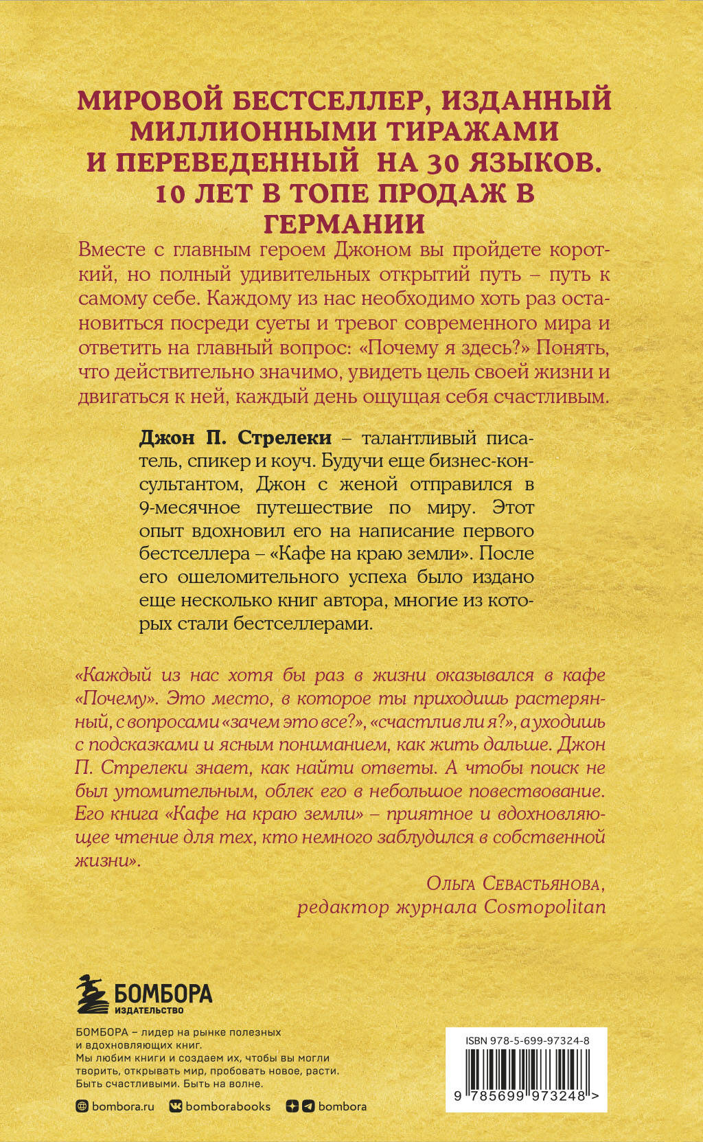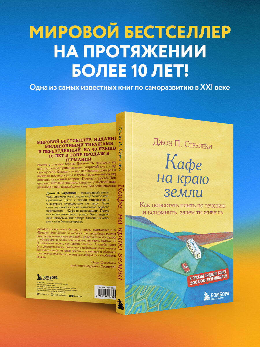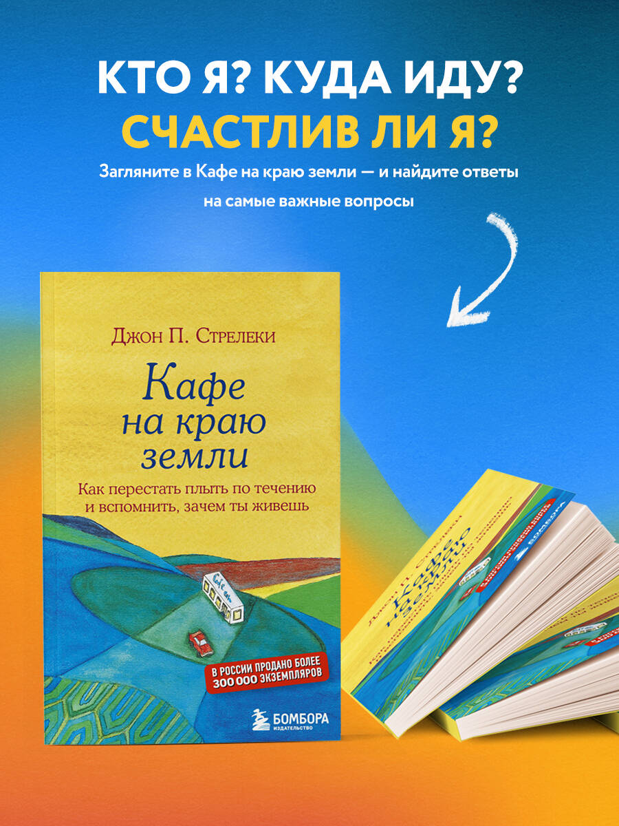 После долгого блуждания в темноте и неизвестности всё, что вам нужно - зайти в уютное кафе, выбрать столик и раскрыть меню. Вместе с главным героем Джоном вы пройдете короткий, но полный удивительных открытий путь - путь к самому себе. Каждому из нас необходимо хоть раз остановиться посреди суеты и тревог современного мира и ответить на главный вопрос: «Почему я здесь?» Понять, что действительно значимо, увидеть цель своей жизни в дымке будущего и двигаться к ней, каждый день ощущая себя счастливым. Эта книга - мировой бестселлер, переведенный на 30 языков, - вдохновит вас на перемены, о которых сегодня вы можете только мечтать. Об авторе Джон П. Стрелеки - талантливый писатель, спикер и коуч. В 2002 году, будучи еще бизнес-консультантом, Джон с женой отправился в девятимесячное путешествие по миру. Этот опыт вдохновил его на написание первого бестселлера - «Кафе на краю земли». После его ошеломительного успеха было издано еще несколько книг автора, многие из которых стали бестселлерами.
